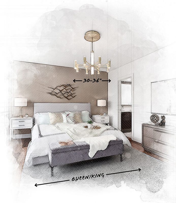 When placing lighting over a bed, you want your chandelier to be perfectly sized for your bed. For a Queen/King sized bed, 36” is usually a perfect fit. For a Full/Twin, 24” is best.