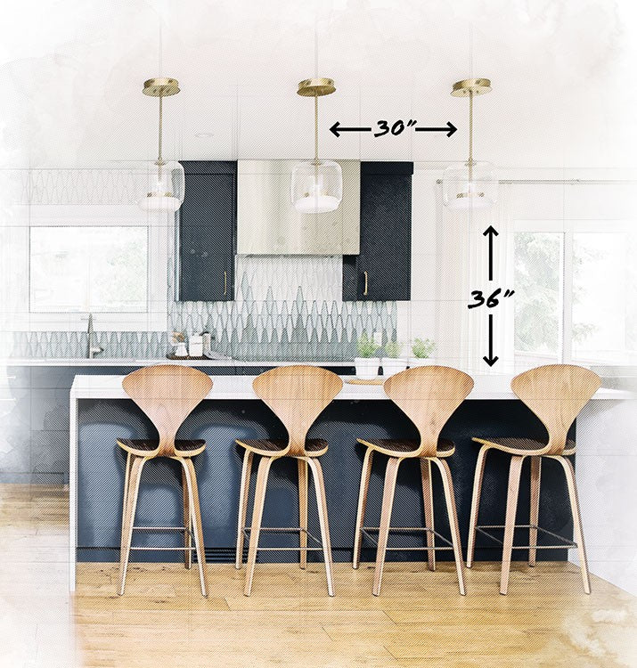 When placing 2 or more pendants over your kitchen island, be sure there is about 30-36" of space between the bottom of the fixture and your countertop. There should always be about 30" of space between each fixture.