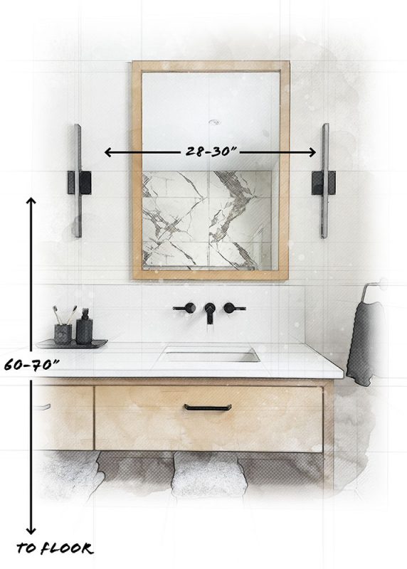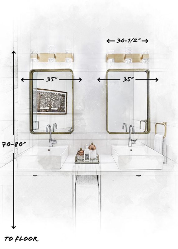 When placing vanity lighting above your bathroom mirrors, be sure to choose lighting that is at least 3”-5” smaller than the width of your mirror. Lighting should be at least 70-80” from the floor.
