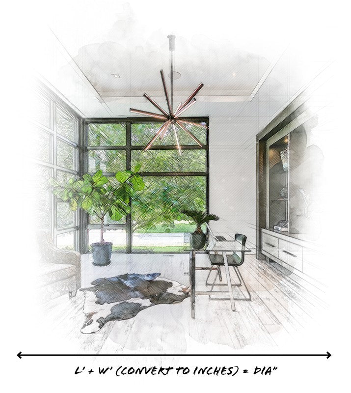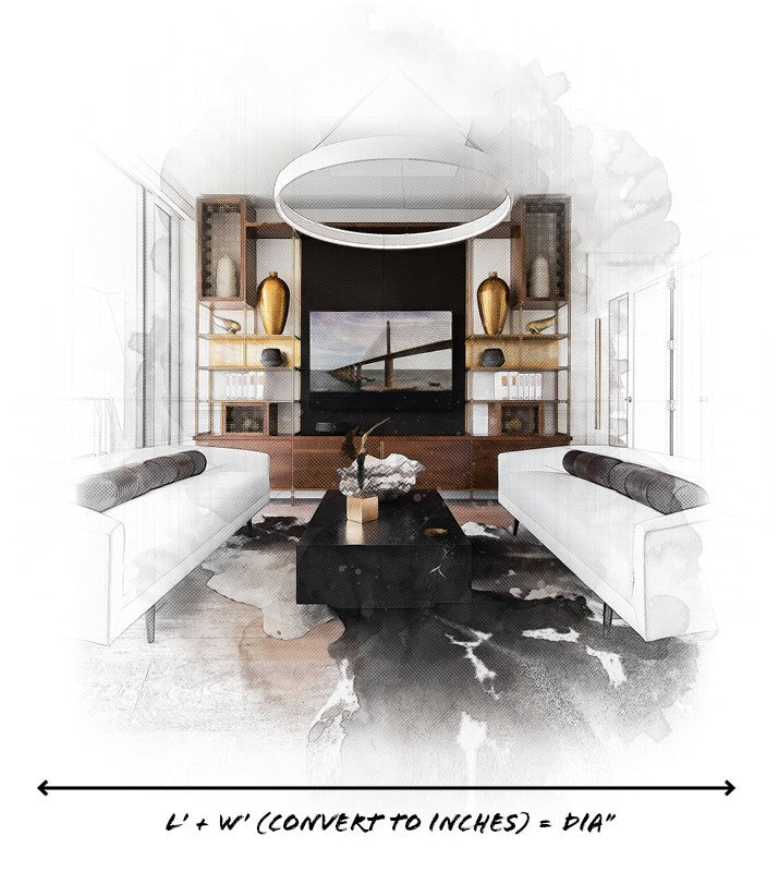 When placing a chandelier or statement piece in your living room, take the length of the room (in feet) and multiply by the width of the room (in feet). Your answer changed to inches should be the ideal diameter of your living room lighting.