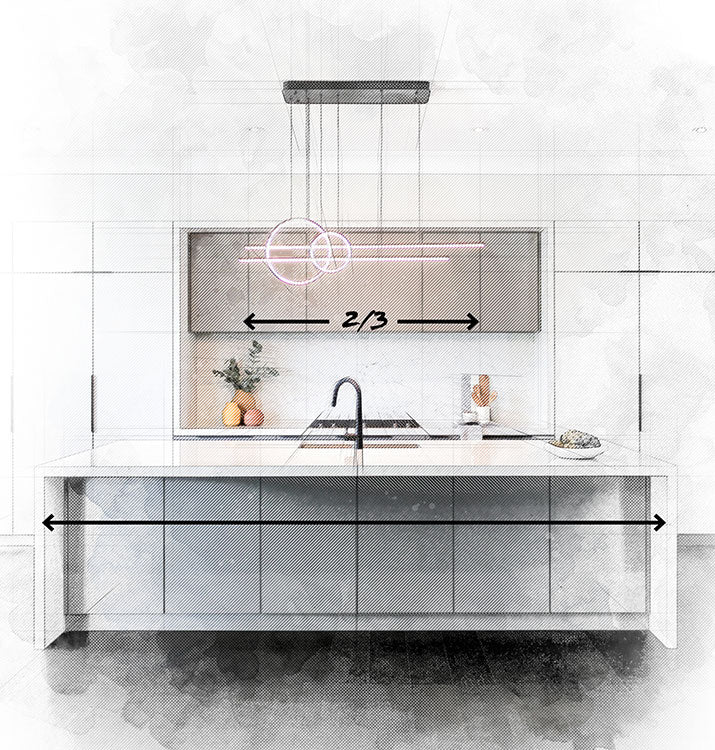 When hanging a linear pendant above your kitchen island, choose a fixture that leaves about 1/3 of your island countertop empty (split between either side).