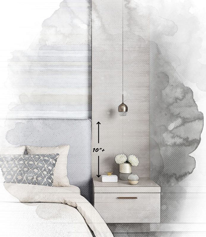 Instead of table lamps taking space on your nightstands, consider hanging minimal pendants as bedside lighting. You want to leave at least 10” of space between the tabletop and the bottom of the lamp so you can reach items like a glass of water or your alarm clock without bumping your lighting. Add more height if you want to add other décor to your nightstand.