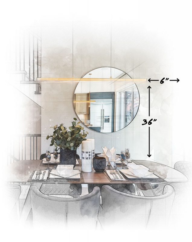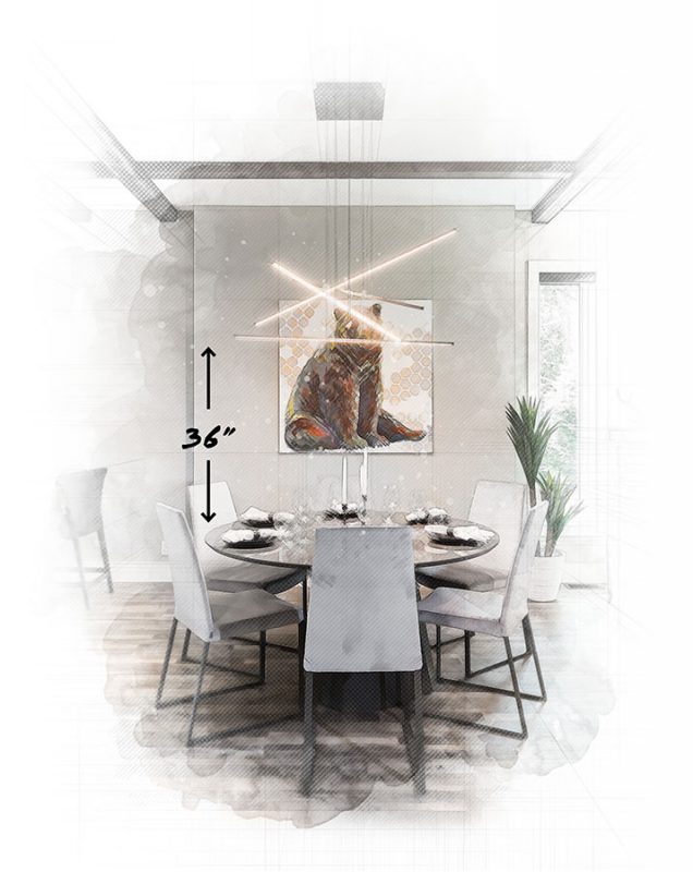 When placing a chandelier or linear pendant over a dining room table, be sure to hang it at least 36” above the top of the table. To ensure balance in your design, it is best to allow for 6” between the edge of your lighting and the edge of your table.