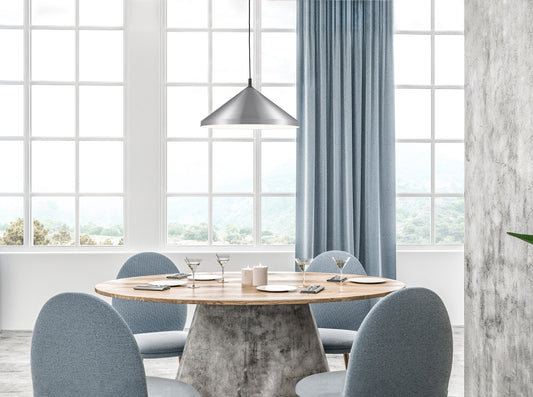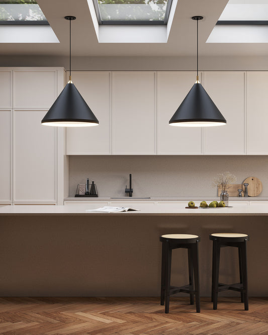Single lamp pendant with conical aluminum shade with fine powder-coated or plated finishes with contrasting finial. Exterior shade colors are black or white with gold detail or brushed nickel with black detail. Suspended by cloth cable. Available in 2 sizes.