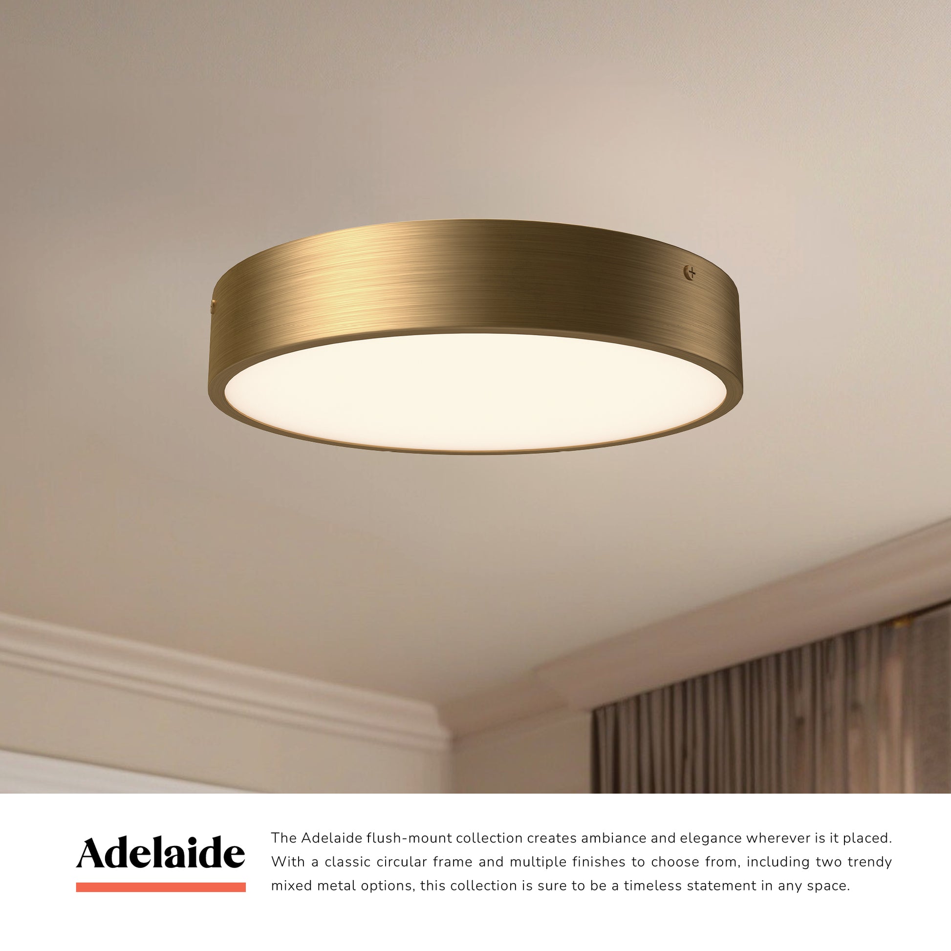 The Adelaide flush-mount collection creates ambiance and elegance wherever is it placed. With a classic circular frame and multiple finishes to choose from, including two trendy mixed metal options, this collection is sure to be a timeless statement in any space.