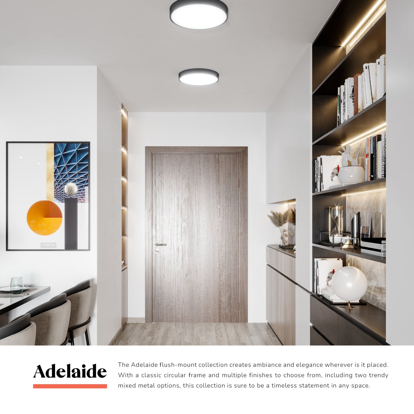 The Adelaide flush-mount collection creates ambiance and elegance wherever is it placed. With a classic circular frame and multiple finishes to choose from, including two trendy mixed metal options, this collection is sure to be a timeless statement in any space.
