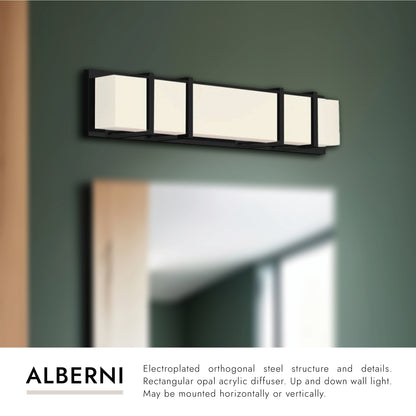 Electroplated orthogonal steel structure and details. Rectangular opal acrylic diffuser. Up and down wall light. May be mounted horizontally or vertically