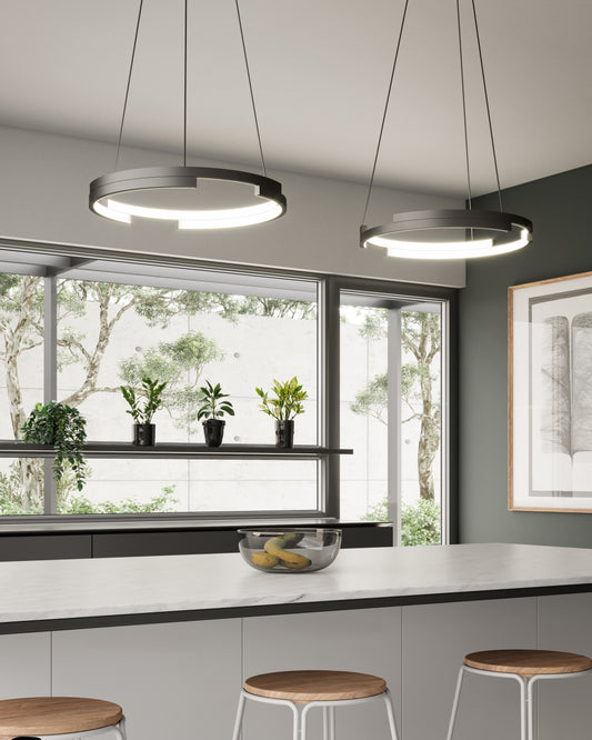 Two layers of straight metal bands combine to form an asymmetric architectural appearance. The offset illuminated components create a dynamic lamp that changes visually depending on your viewpoint.