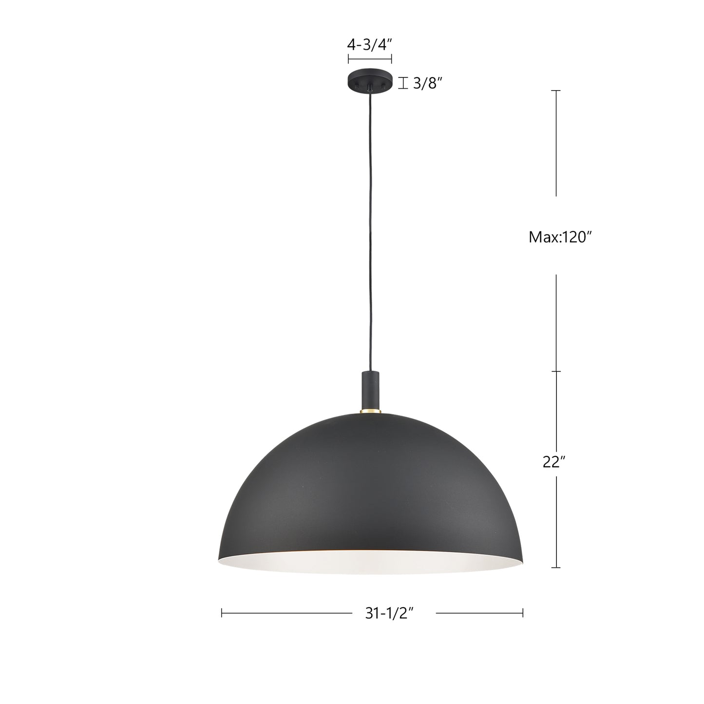 Single-lamp pendant with aluminum dome shade showcasing powder-coated or plated finishes with metal details and a matte white interior. Exterior shade colors are black, brushed nickel, or white. Suspended by cloth cable. Available in three sizes.
