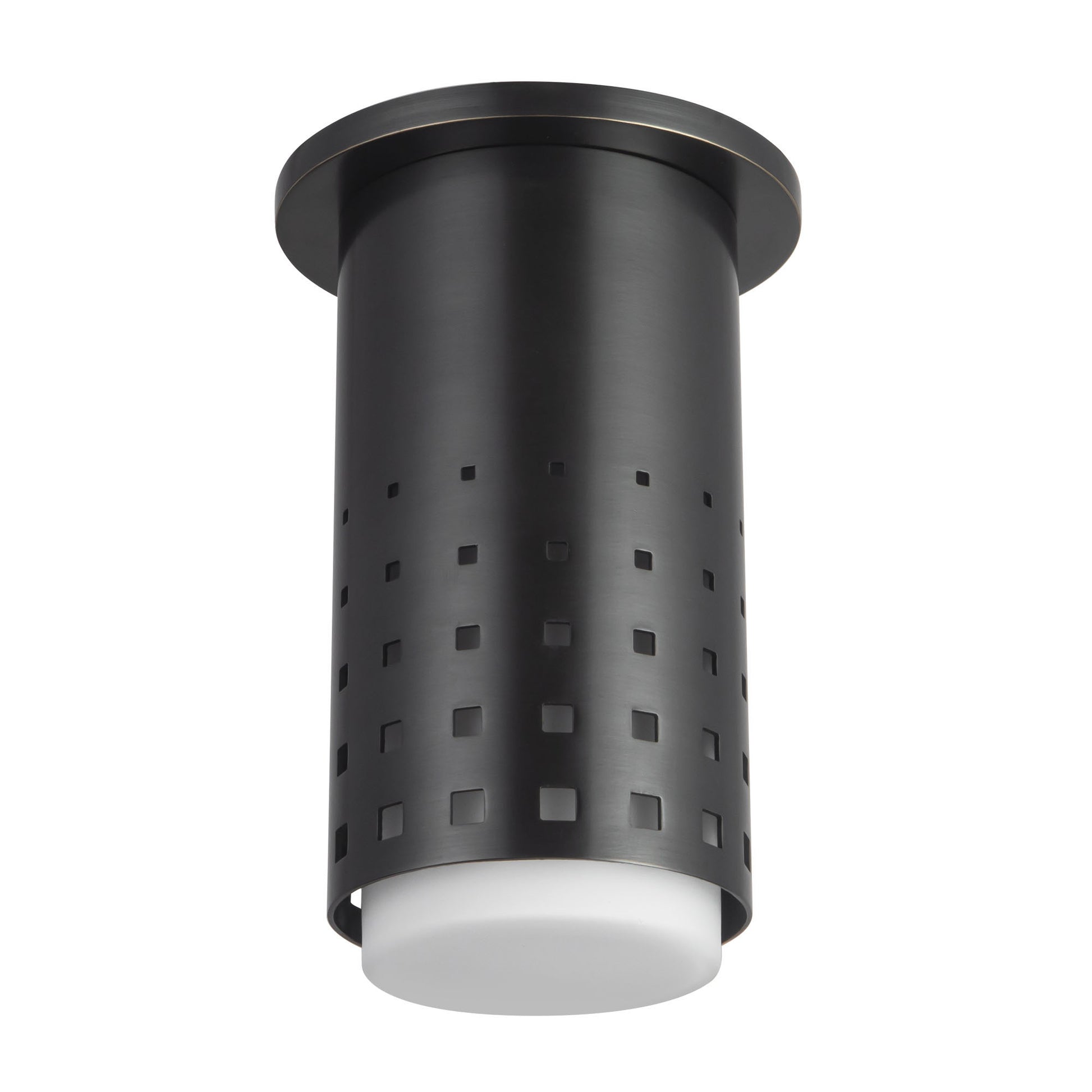 - Flush mount by Peyton Fox with opal glass diffuser and brass plated punched metal overlay