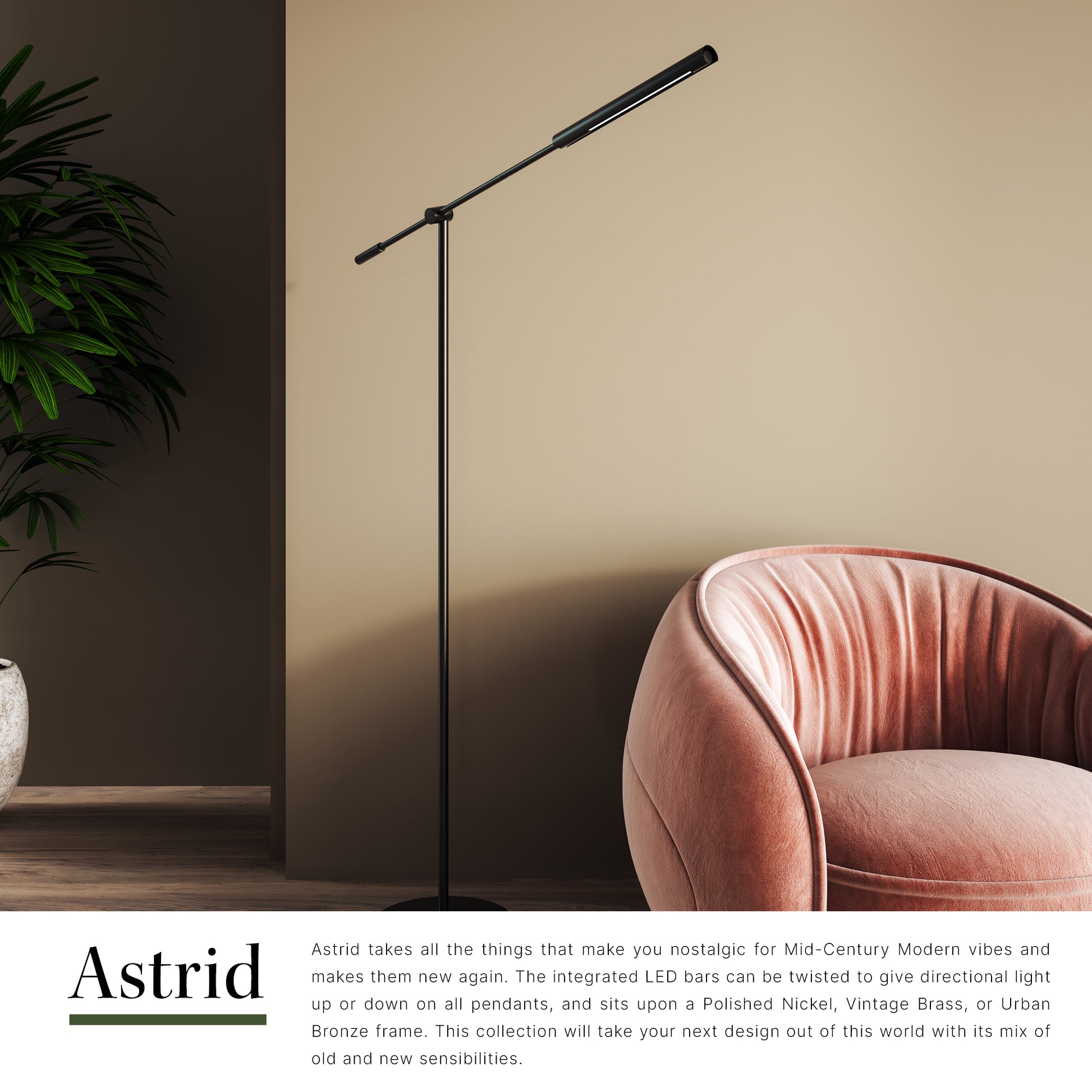 Astrid takes all the things that make you nostalgic for Mid-Century Modern vibes and makes them new again. The integrated LED bars can be twisted to give directional light up or down on all pendants, and sits upon a Polished Nickel, Vintage Brass, or Urban Bronze frame. This collection will take your next design out of this world with its mix of old and new sensibilities.