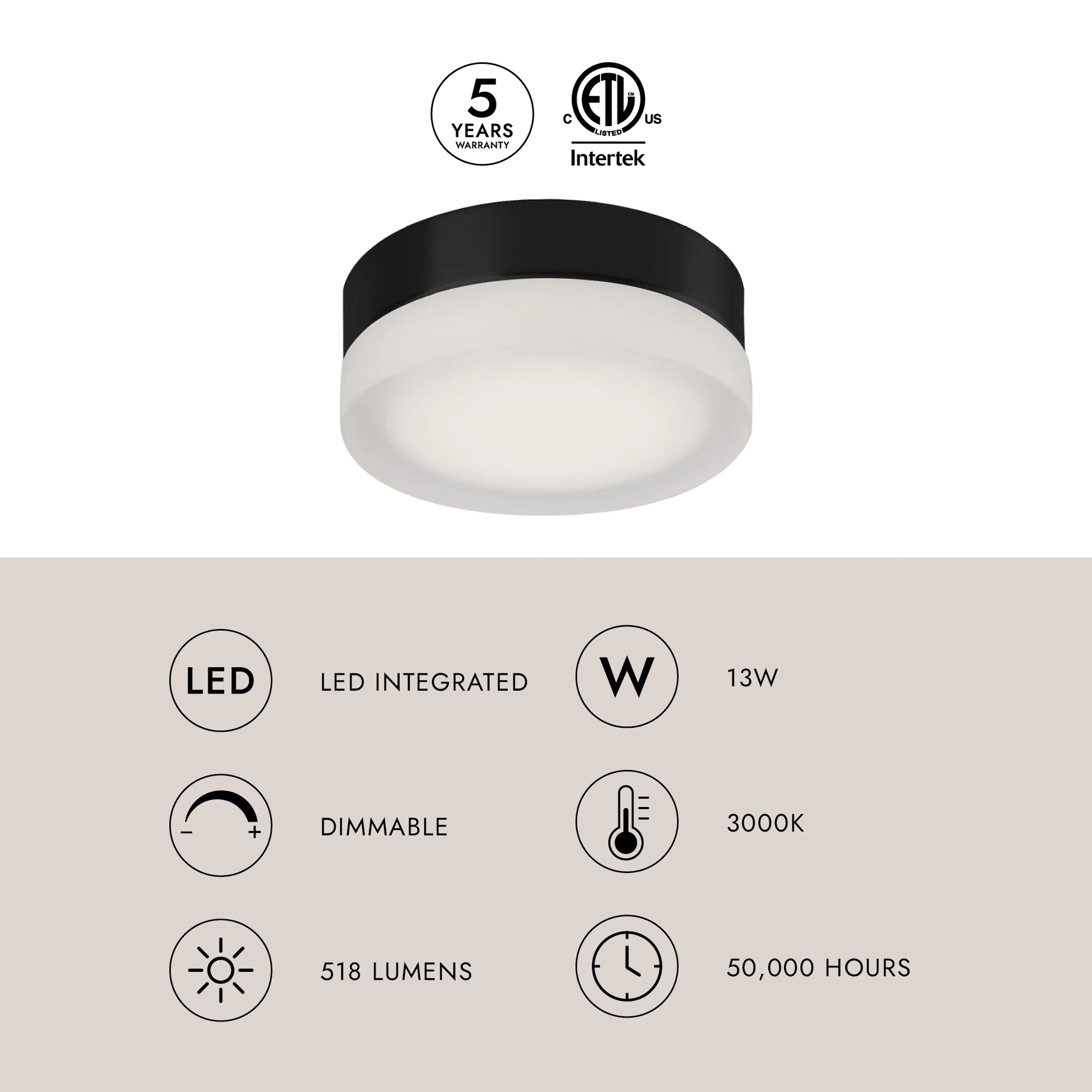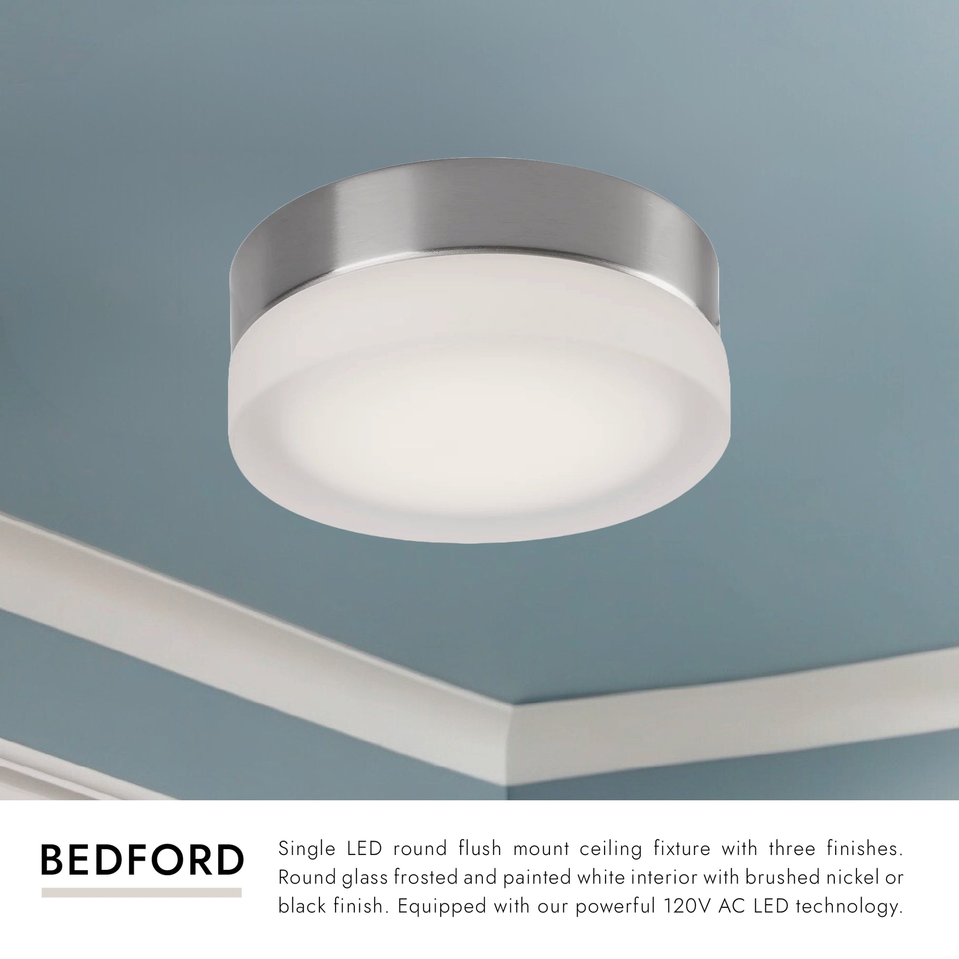 Single LED round flush mount ceiling fixture with three finishes. Round glass frosted and painted white interior with brushed nickel or black finish. Equipped with our powerful 120V AC LED technology.