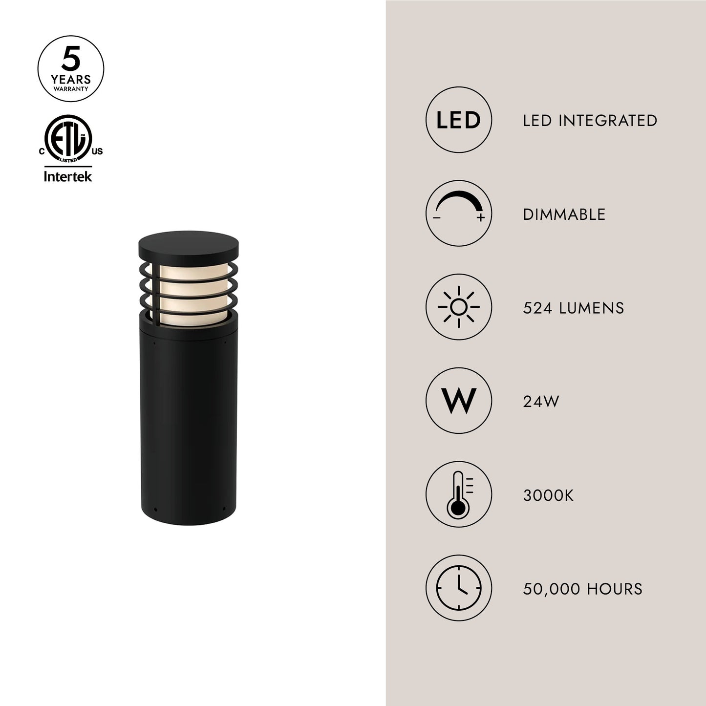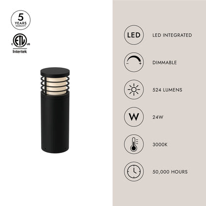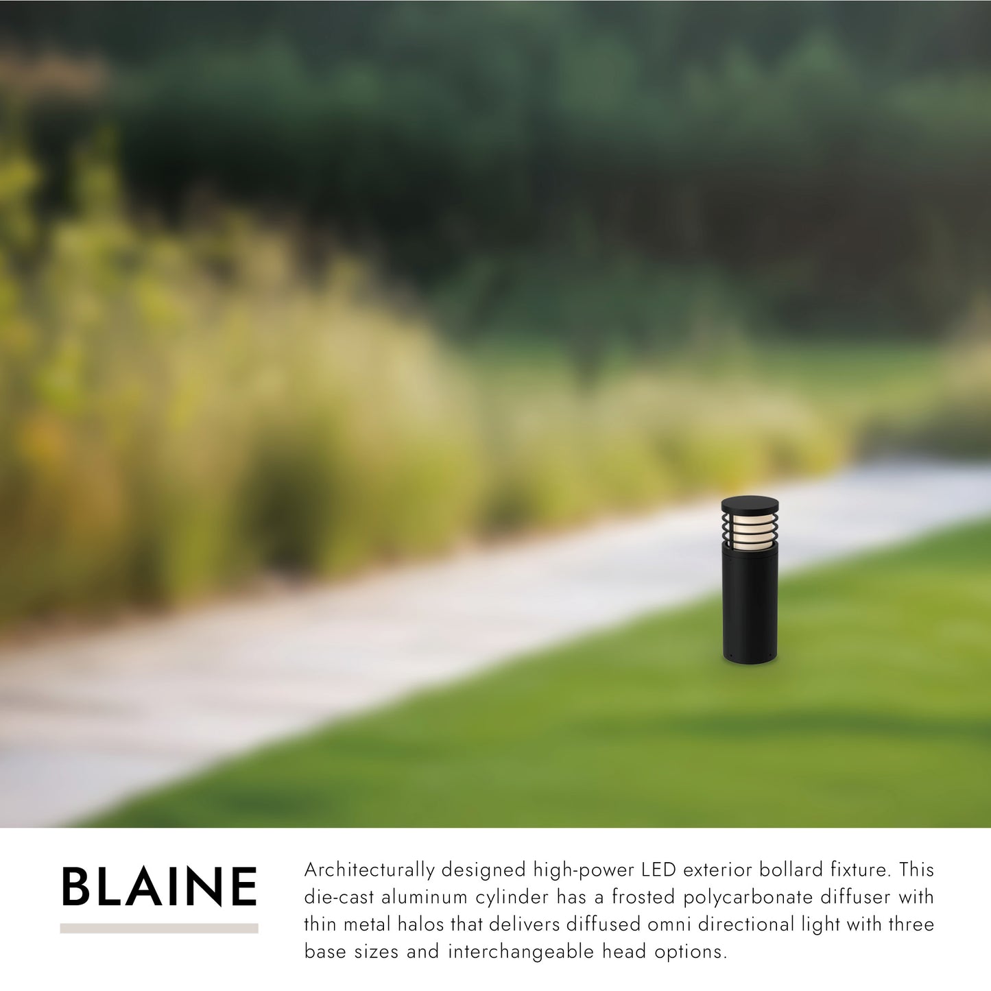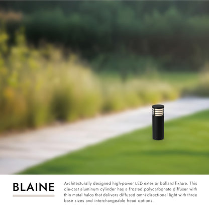 Architecturally designed high-power LED exterior bollard fixture. This die-cast aluminum cylinder has a frosted polycarbonate diffuser with thin metal halos that delivers diffused omni directional light with three base sizes and interchangeable head options.