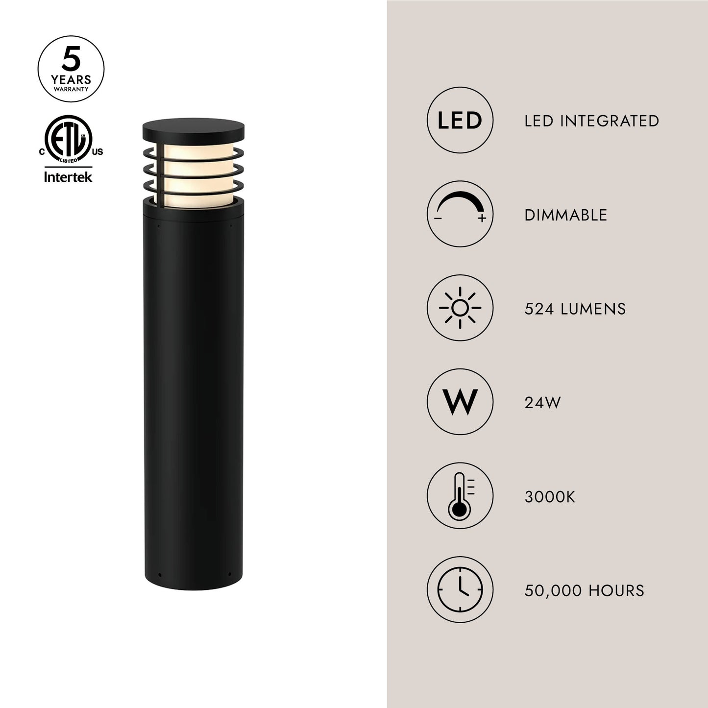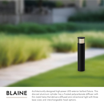 Architecturally designed high-power LED exterior bollard fixture. This die-cast aluminum cylinder has a frosted polycarbonate diffuser with thin metal halos that delivers diffused omni directional light with three base sizes and interchangeable head options.