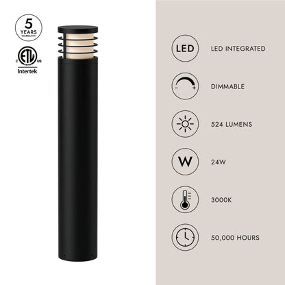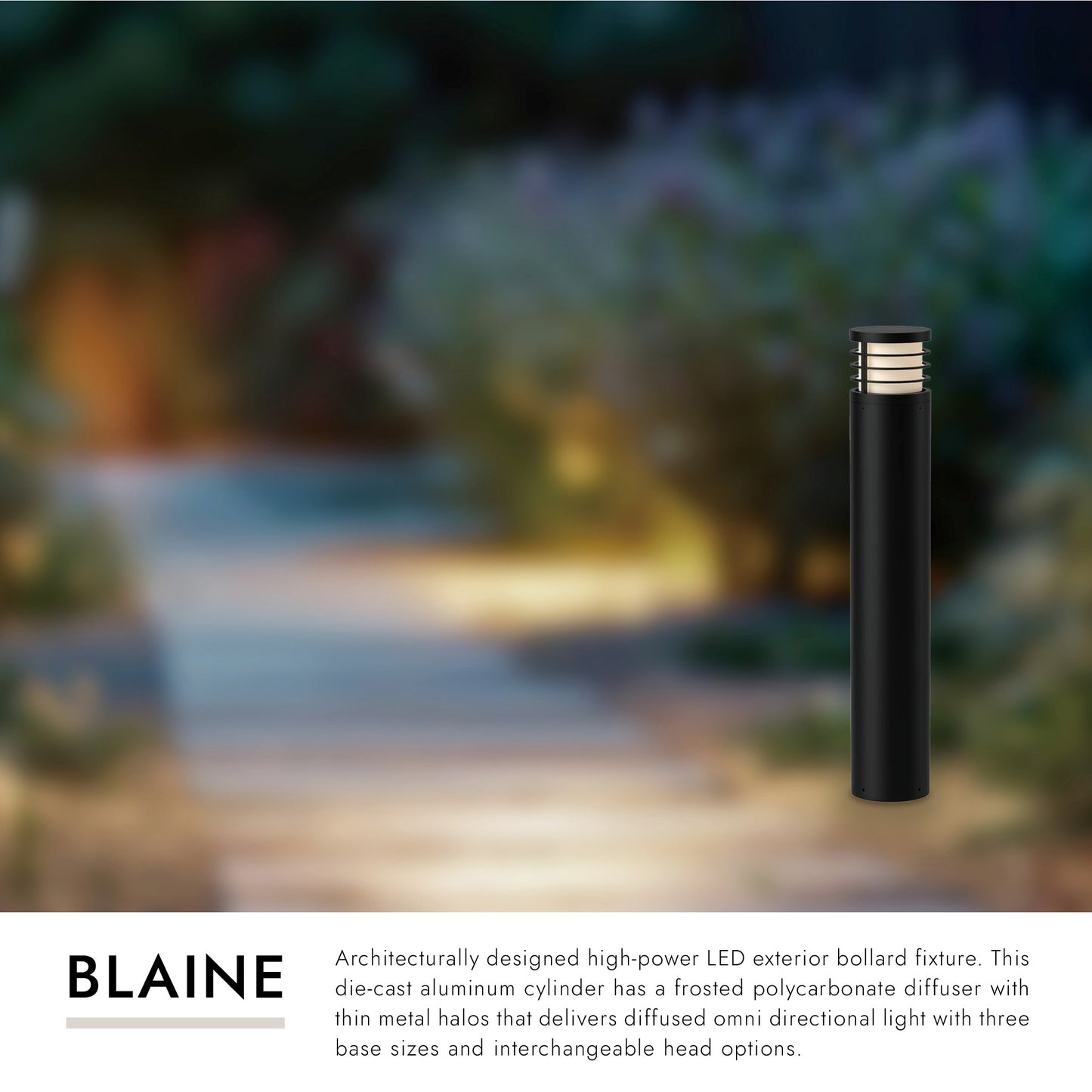 Architecturally designed high-power LED exterior bollard fixture. This die-cast aluminum cylinder has a frosted polycarbonate diffuser with thin metal halos that delivers diffused omni directional light with three base sizes and interchangeable head options.