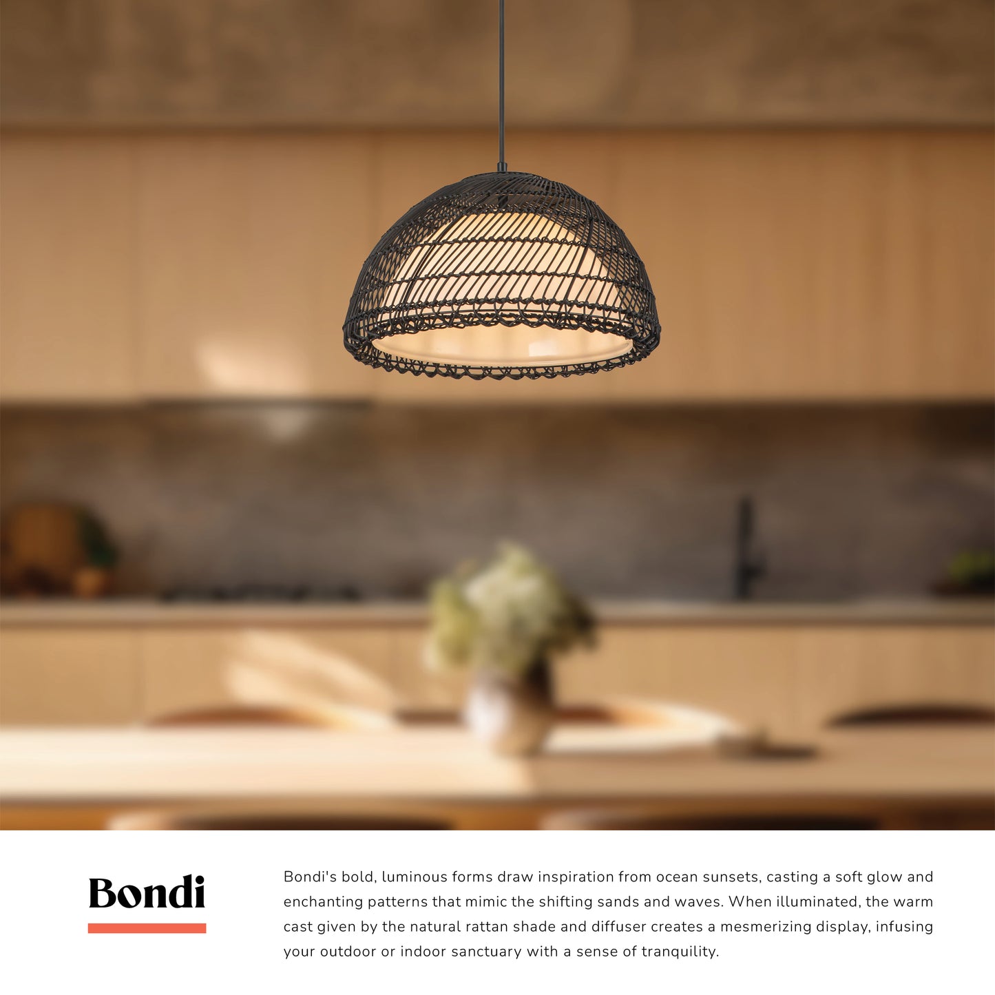 Bondi's bold, luminous forms draw inspiration from ocean sunsets, casting a soft glow and enchanting patterns that mimic the shifting sands and waves. When illuminated, the warm cast given by the natural rattan shade and diffuser creates a mesmerizing display, infusing your outdoor or indoor sanctuary with a sense of tranquility.