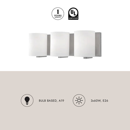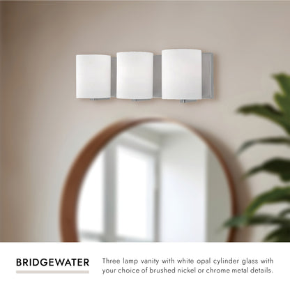Three lamp vanity with white opal cylinder glass with your choice of brushed nickel or chrome metal details.