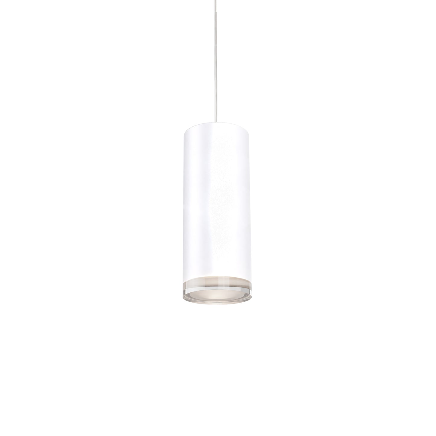 Single LED cylinder shaped pendant with glass disc. Equipped with our powerful 120V AC LED technology, with metal details in white, black or brushed nickel finish. Round canopy matches the selected finish.