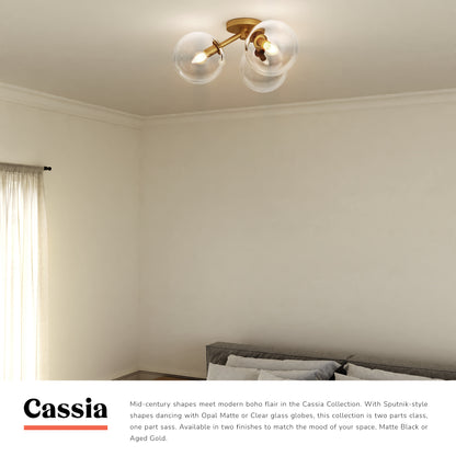 Mid-century shapes meet modern boho flair in the Cassia Collection. With Sputnik-style shapes dancing with Opal Matte or Clear glass globes, this collection is two parts class, one part sass. Available in two finishes to match the mood of your space, Matte Black or Aged Gold.