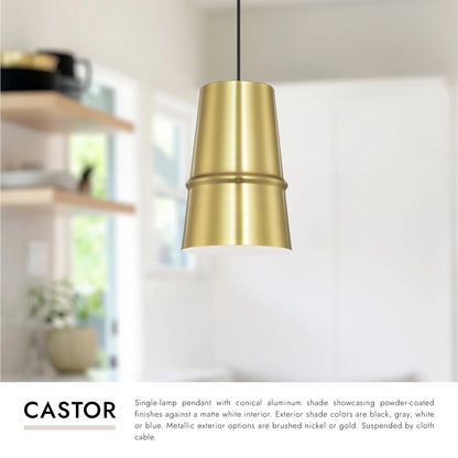 Single-lamp pendant with conical aluminum shade showcasing powder-coated finishes against a matte white interior. Exterior shade colors are black, gray, white or blue. Metallic exterior options are brushed nickel or gold. Suspended by cloth cable