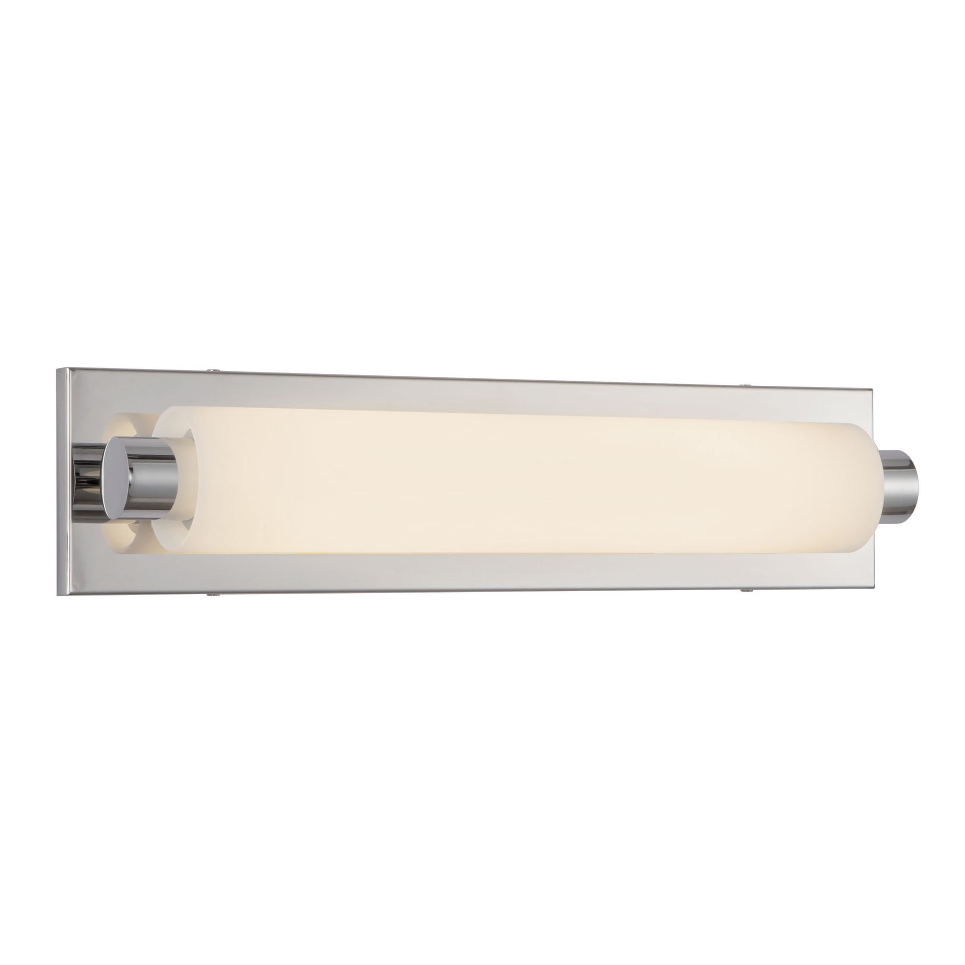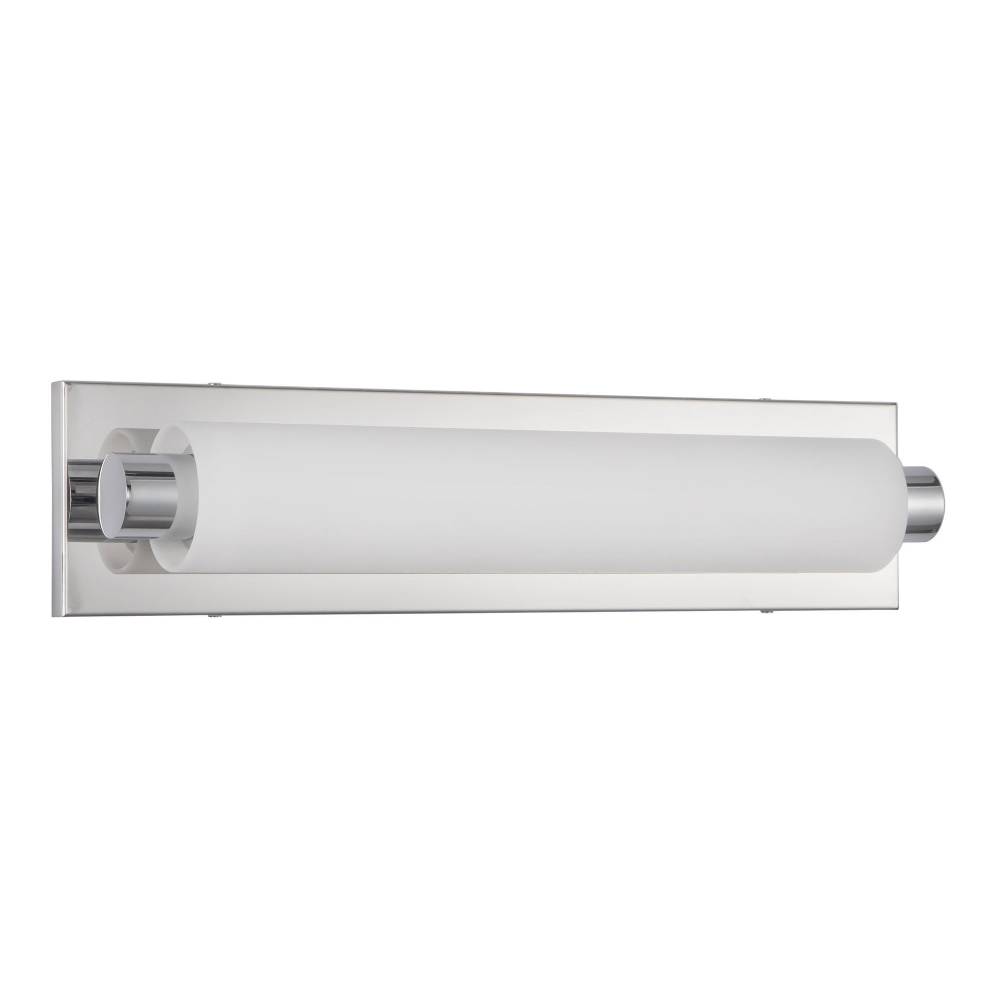 Modern LED vanity with cylinder shaped white opal glass. Metal details in chrome finish with our powerful 120V AC LED technology. Matching wall sconces available; see series for more information.