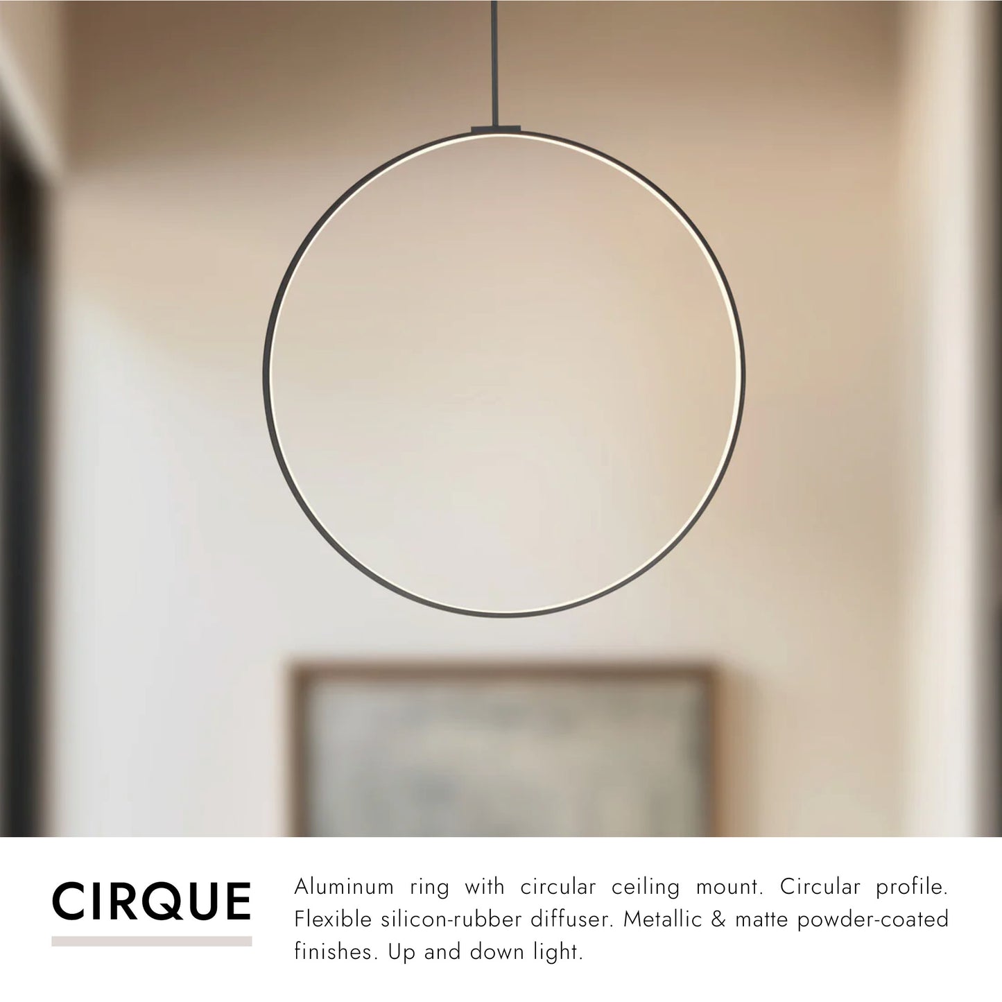Aluminum ring with circular ceiling mount. Circular profile. Flexible silicon-rubber diffuser. Metallic & matte powder-coated finishes. Up and down light.