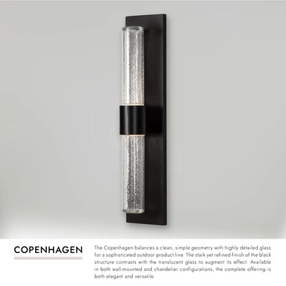 The Copenhagen balances a clean, simple geometry with highly detailed glass for a sophisticated outdoor product line. The stark yet refined finish of the black structure contrasts with the translucent glass to augment its effect. Available in both wall-mounted and chandelier configurations, the complete offering is both elegant and versatile.