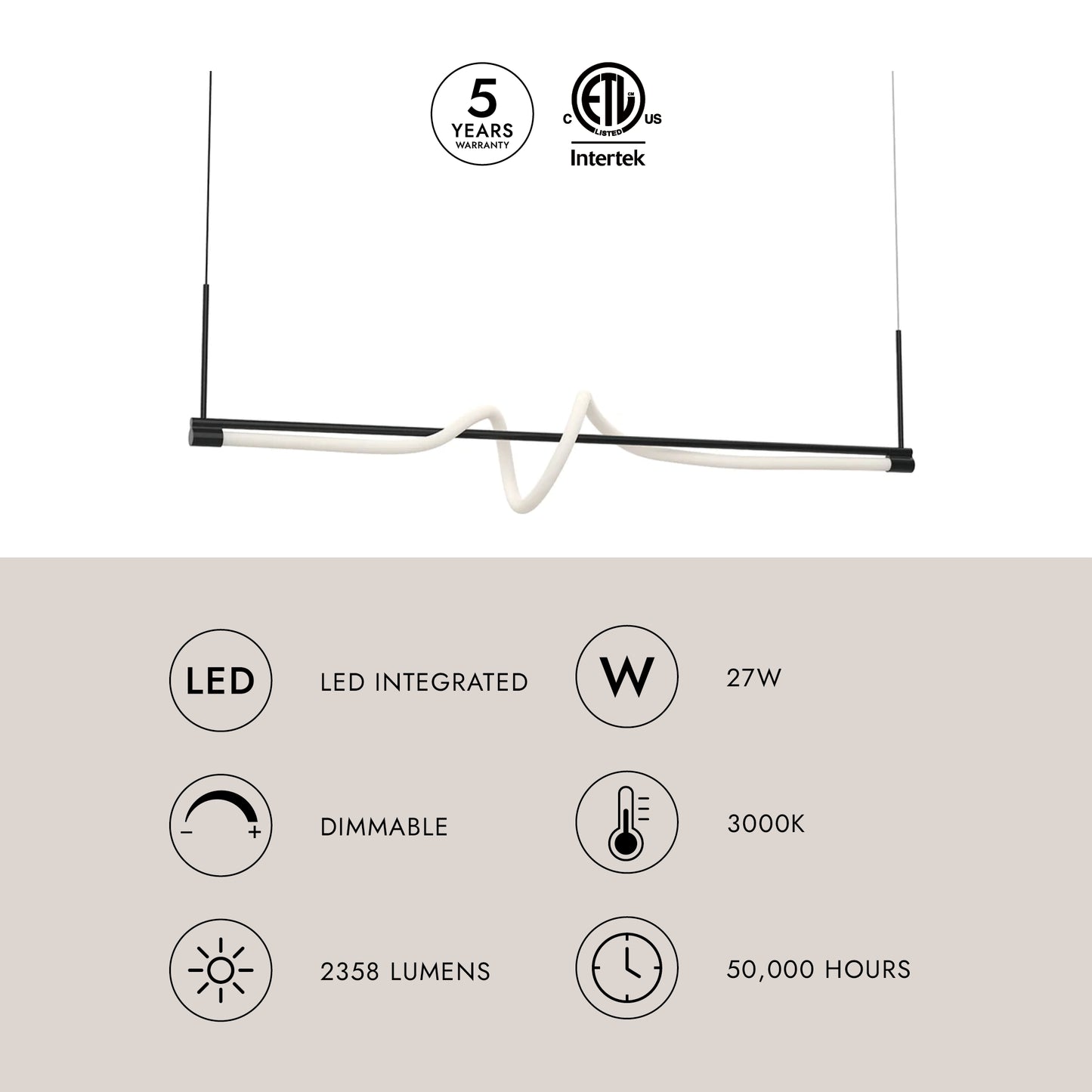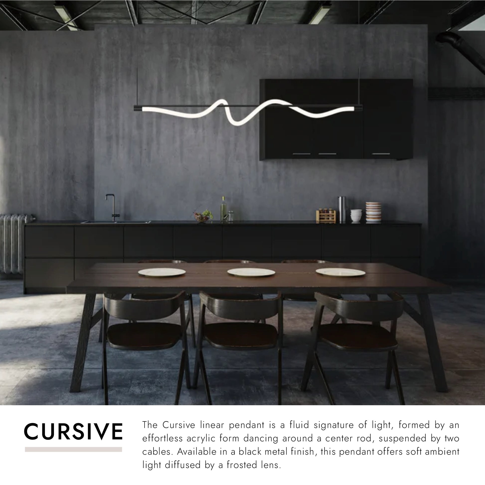 The Cursive linear pendant is a fluid signature of light, formed by an effortless acrylic form dancing around a center rod, suspended by two cables. Available in a black metal finish, this pendant offers soft ambient light diffused by a frosted lens.