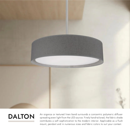 An organza or textured linen band surrounds a concentric polymeric diffuser spreading even light from the LED source. Finely hand-tailored, the fabric shade contributes a soft sophistication to the modern interior. Applicable as a flush mount, pendant and in numerous sizes and fabric colors to suit your context.