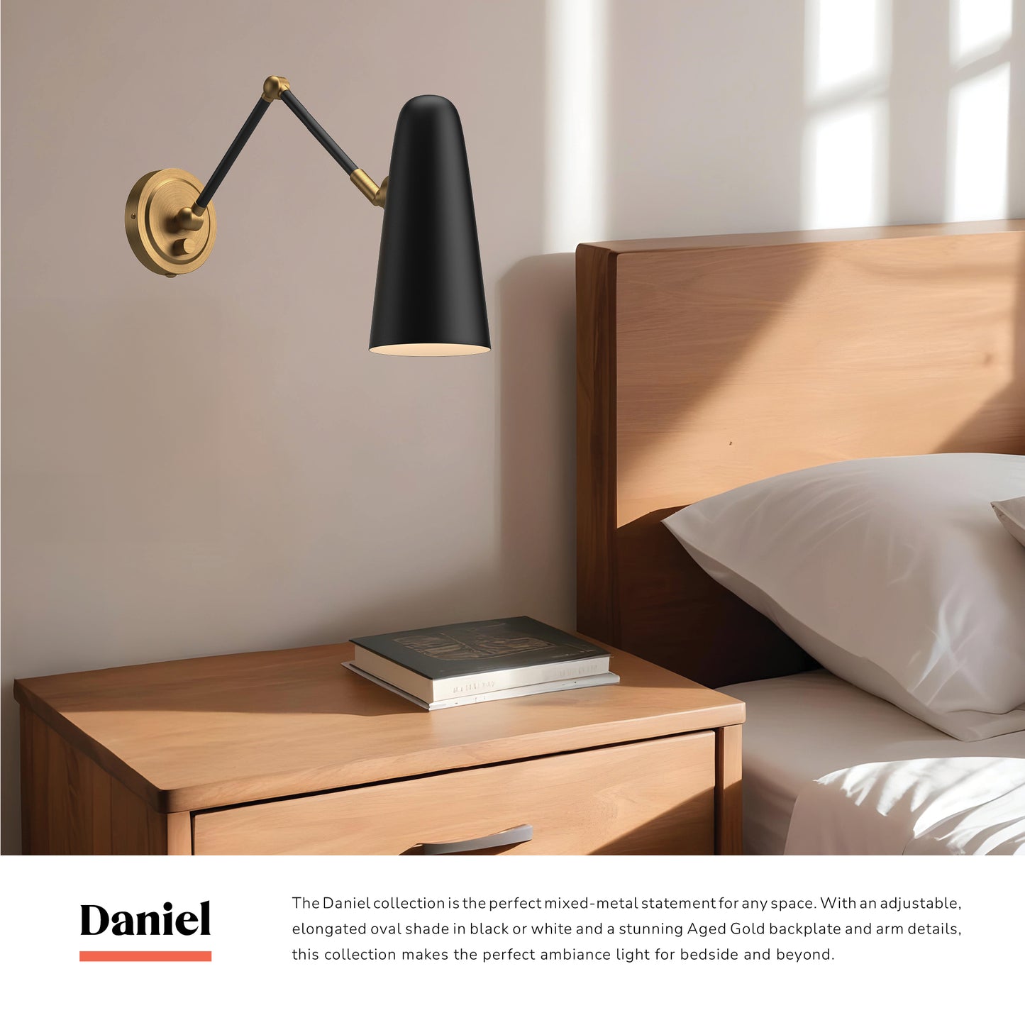 The Daniel collection is the perfect mixed-metal statement for any space. With an adjustable, elongated oval shade in black or white and a stunning Aged Gold backplate and arm details, this collection makes the perfect ambiance light for bedside and beyond.