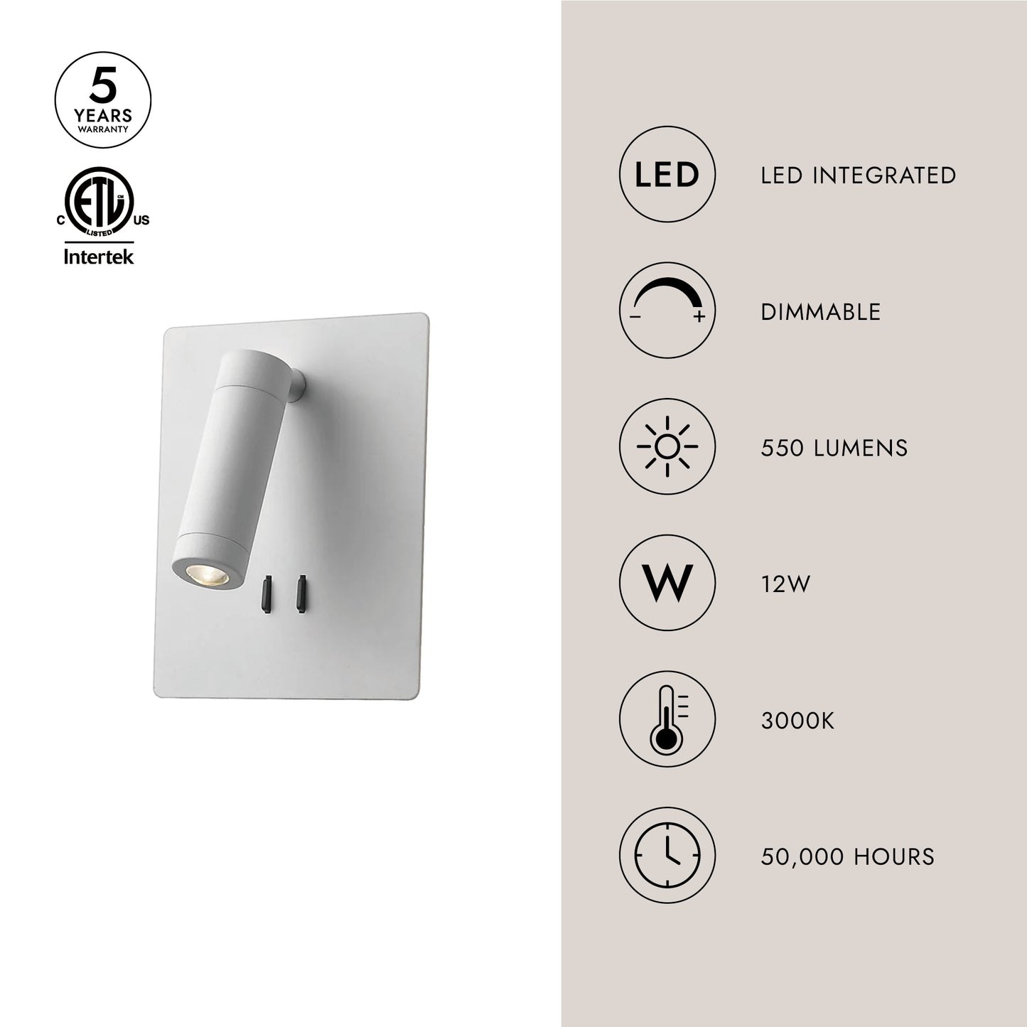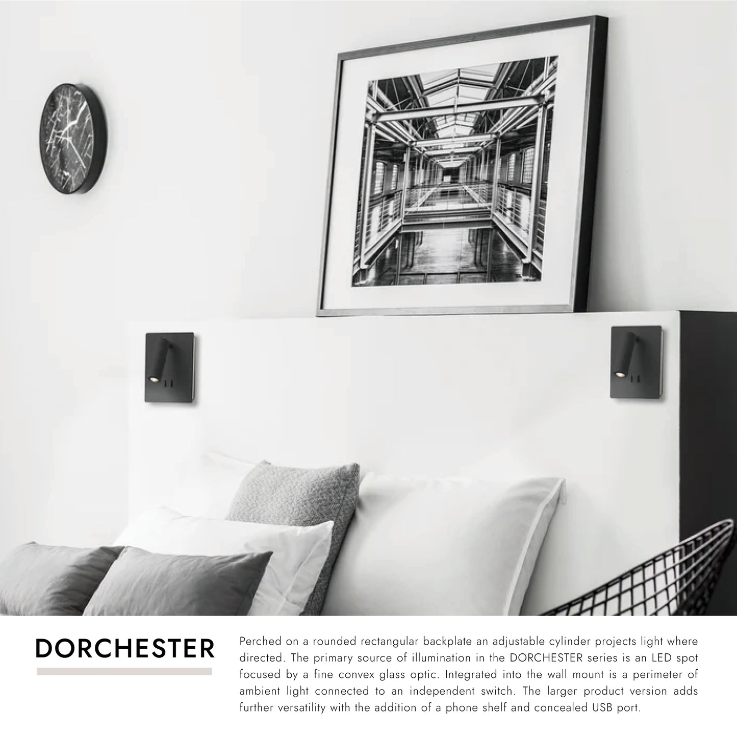 Perched on a rounded rectangular backplate an adjustable cylinder projects light where directed. The primary source of illumination in the DORCHESTER series is an LED spot focused by a fine convex glass optic. Integrated into the wall mount is a perimeter of ambient light connected to an independent switch. The larger product version adds further versatility with the addition of a phone shelf and concealed USB port.