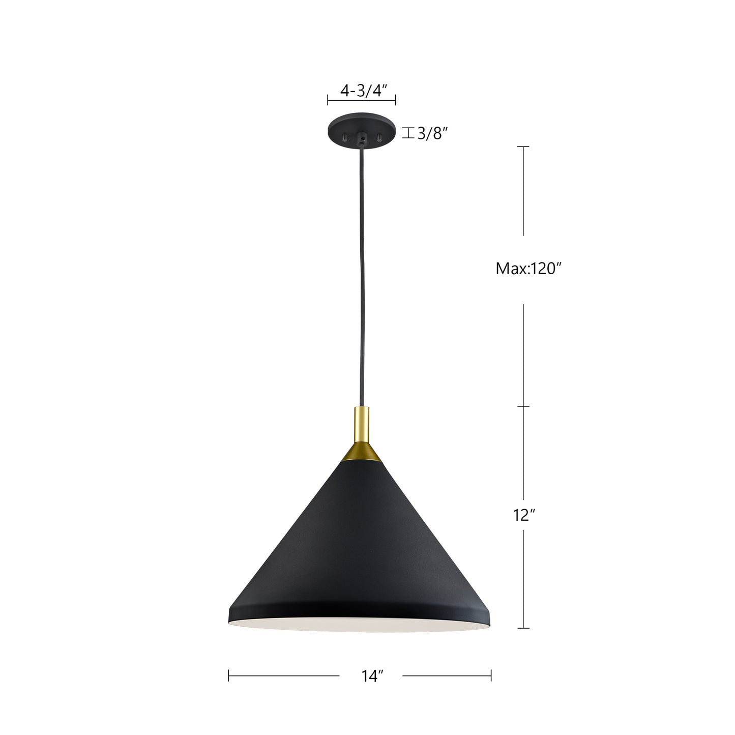 Single lamp pendant with conical aluminum shade with fine powder-coated or plated finishes with contrasting finial. Exterior shade colors are black or white with gold detail or brushed nickel with black detail. Suspended by cloth cable. Available in 2 sizes.