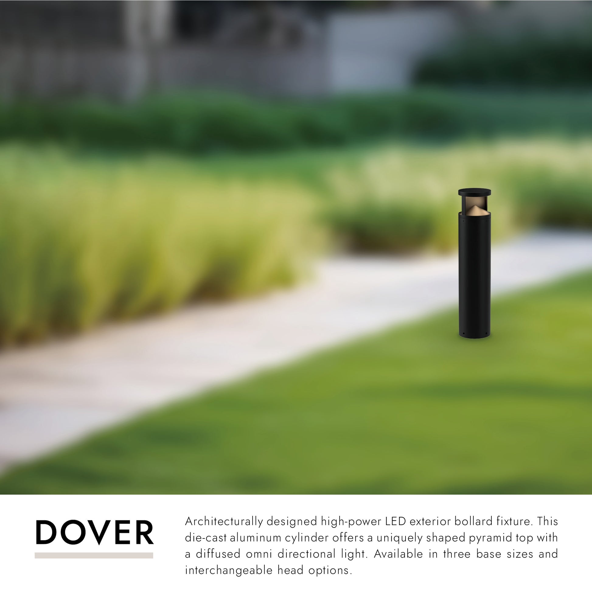 Architecturally designed high-power LED exterior bollard fixture. This die-cast aluminum cylinder offers a uniquely shaped pyramid top with a diffused omni directional light. Available in three base sizes and interchangeable head options.