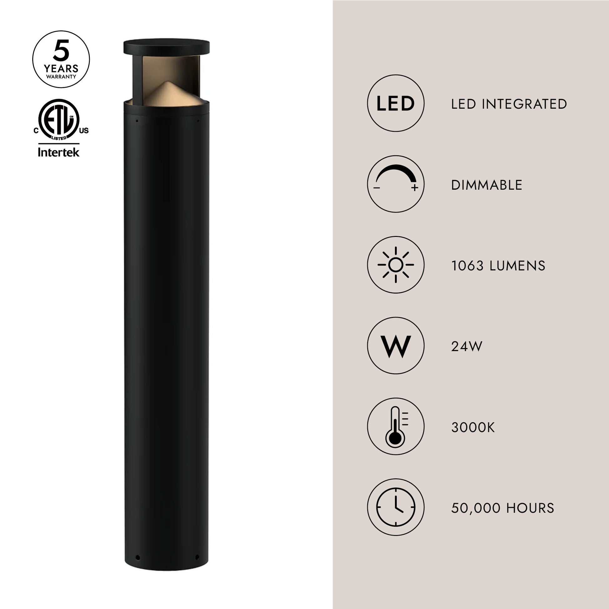 Architecturally designed high-power LED exterior bollard fixture. This die-cast aluminum cylinder offers a uniquely shaped pyramid top with a diffused omni directional light. Available in three base sizes and interchangeable head options.