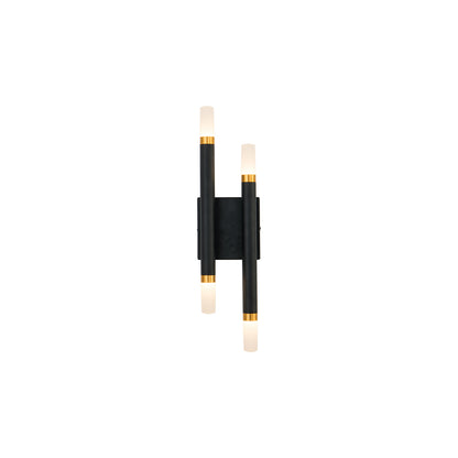 Cylindrical aluminum arms extend from square wall mount. Finely textured powder-coat finish. Tapered round translucent diffusers. Plated-brushed gold accent rings. Up and down light. Custom options available.