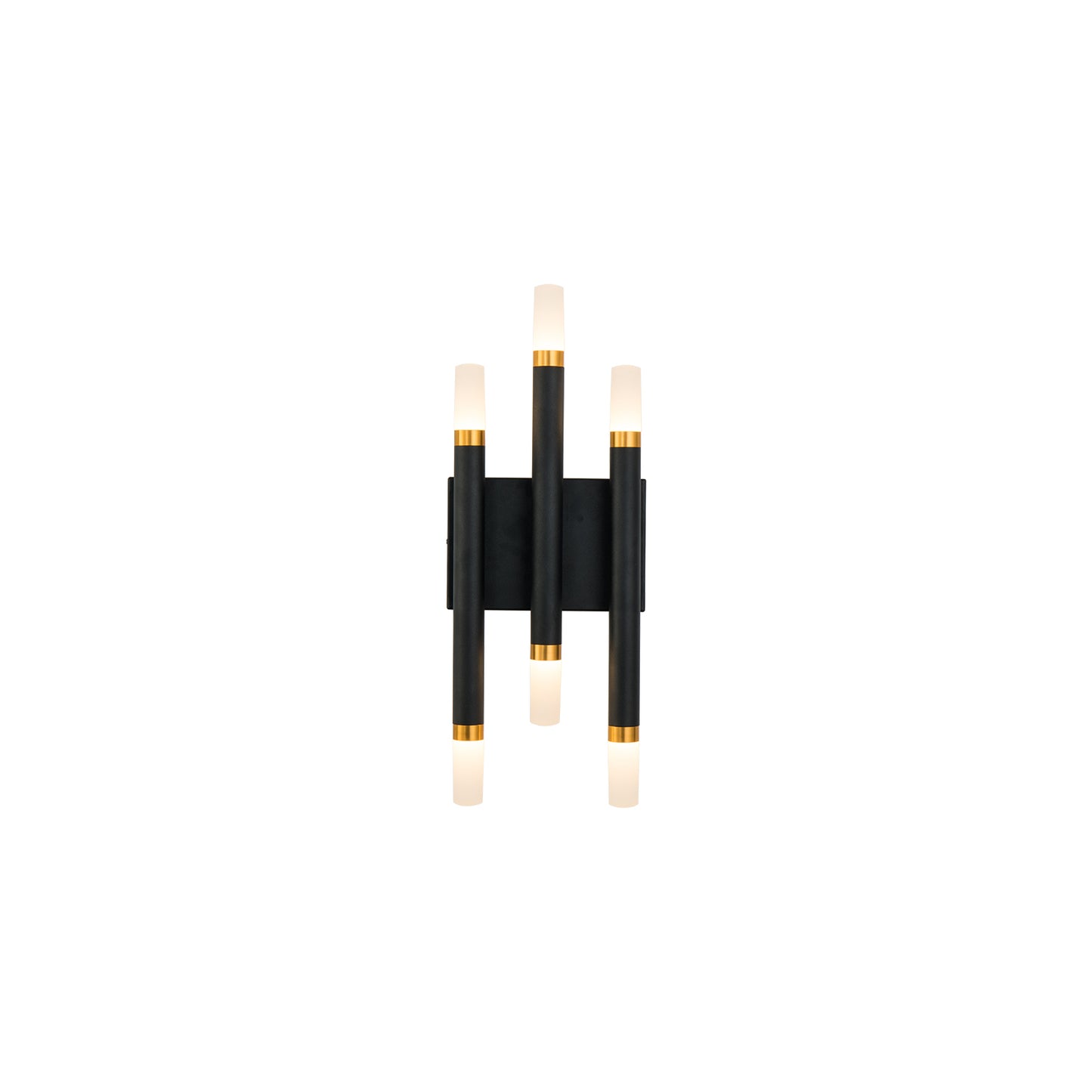 Cylindrical aluminum arms extend from square wall mount. Finely textured powder-coat finish. Tapered round translucent diffusers. Plated-brushed gold accent rings. Up and down light. Custom options available.