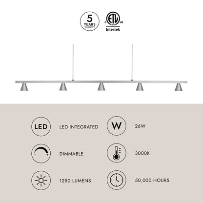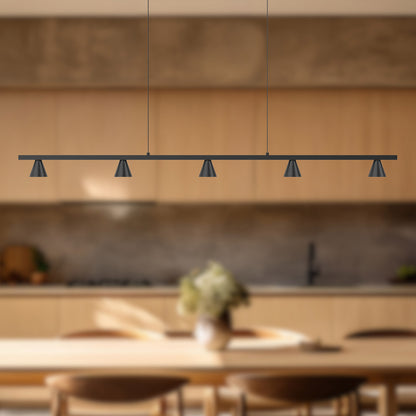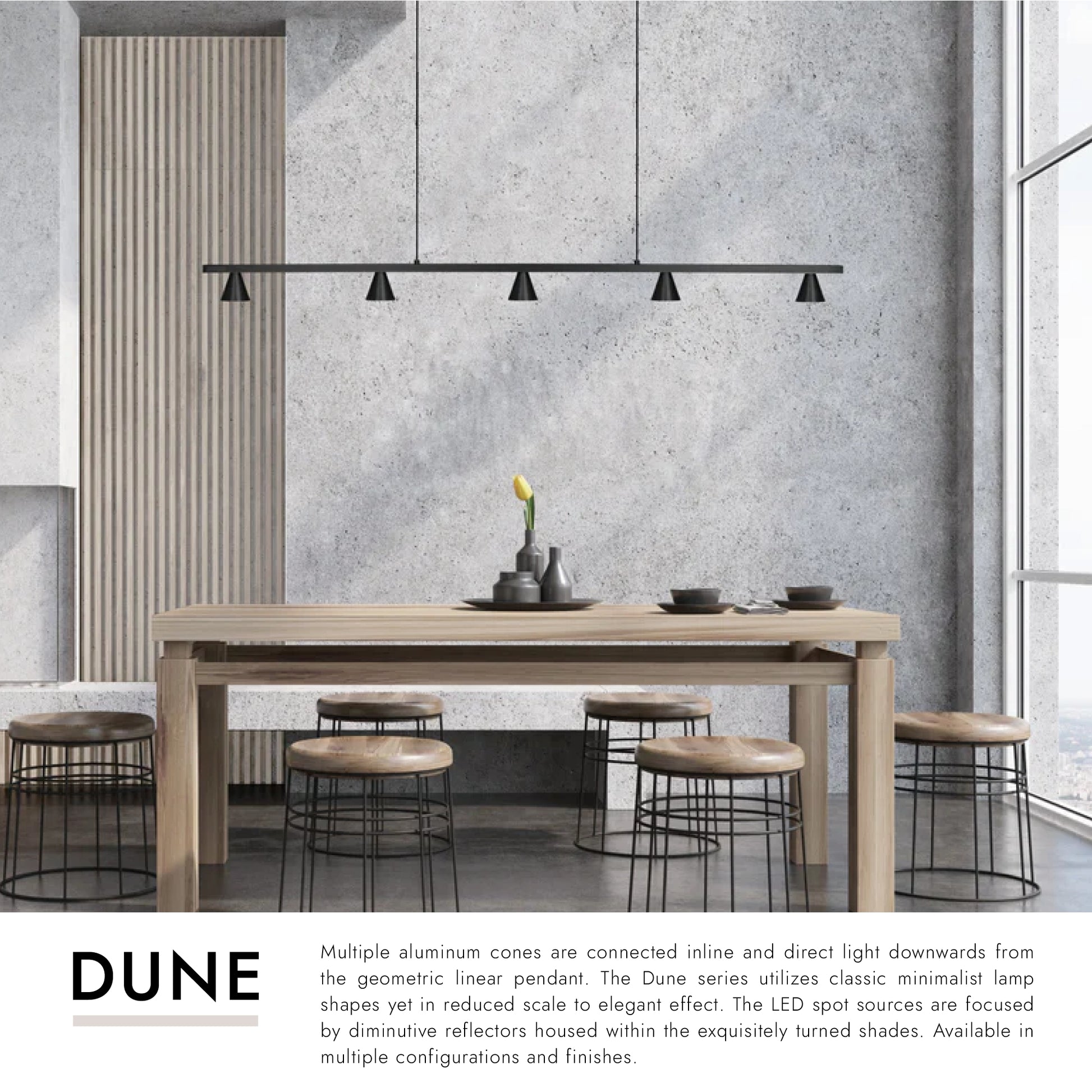 Multiple aluminum cones are connected inline and direct light downwards from the geometric linear pendant. The Dune series utilizes classic minimalist lamp shapes yet in reduced scale to elegant effect. The LED spot sources are focused by diminutive reflectors housed within the exquisitely turned shades. Available in multiple configurations and finishes.
