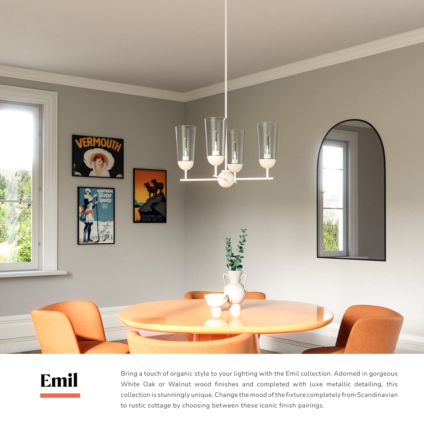 Bring a touch of organic style to your lighting with the Emil collection. Adorned in gorgeous White Oak or Walnut wood finishes and completed with luxe metallic detailing, this collection is stunningly unique. Change the mood of the fixture completely from Scandinavian to rustic cottage by choosing between these iconic finish pairings.