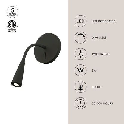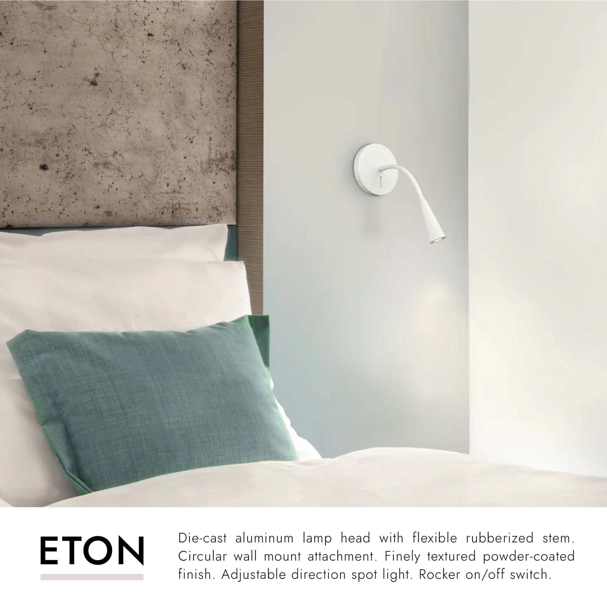Die-cast aluminum lamp head with flexible rubberized stem. Circular wall mount attachment. Finely textured powder-coated finish. Adjustable direction spot light. Rocker on/off switch.