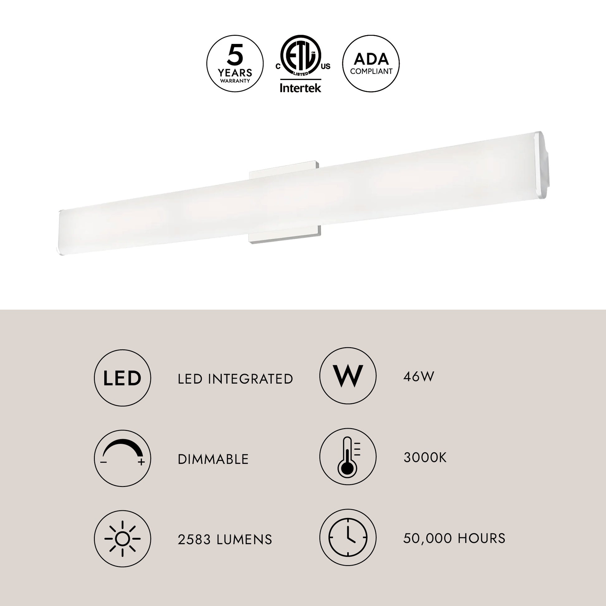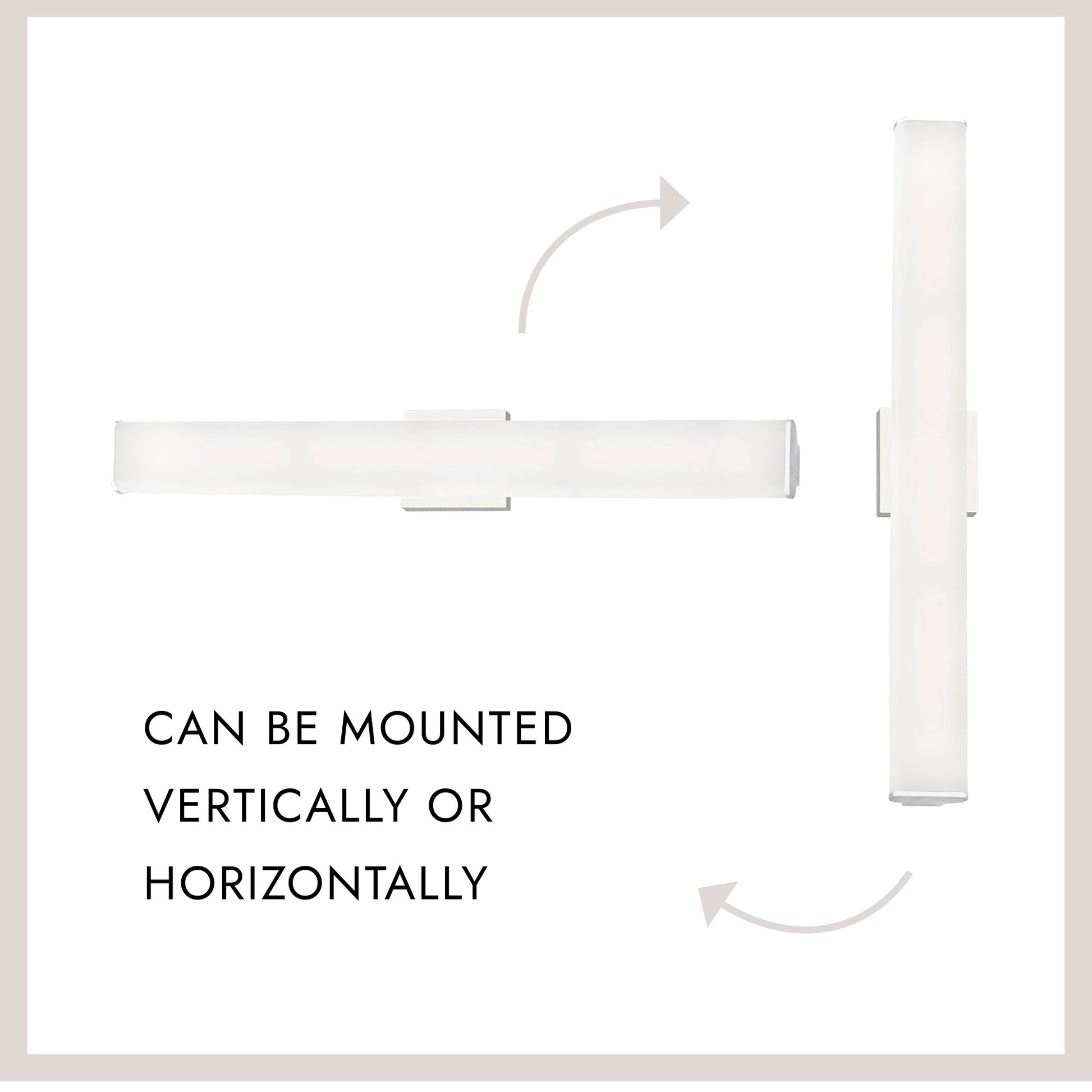 An extruded oblong diffuser surrounds the LED source of the geometric vanity fixture and gently spreads light. Enclosed at the ends by two thick caps the design is characterized by minimal details and clever features. During installation the lamp assembly may slide on the mounting track to allow for ideal positioning. Adding to the versatile function are the multiple fixture lengths and mounting orientations. Optional installation without backplate for smaller junction boxes.