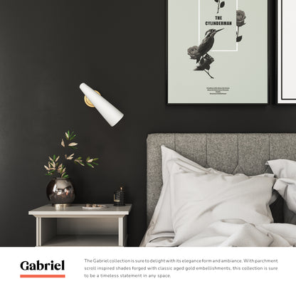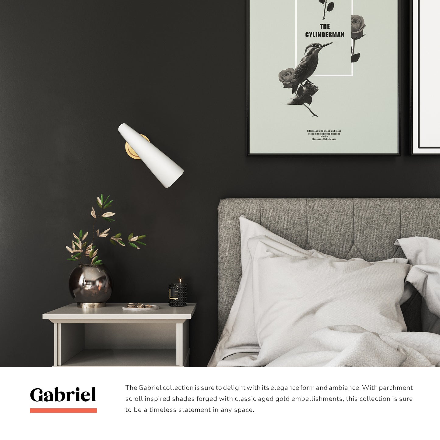 The Gabriel collection is sure to delight with its elegance form and ambiance. With parchment scroll inspired shades forged with classic aged gold embellishments, this collection is sure to be a timeless statement in any space.