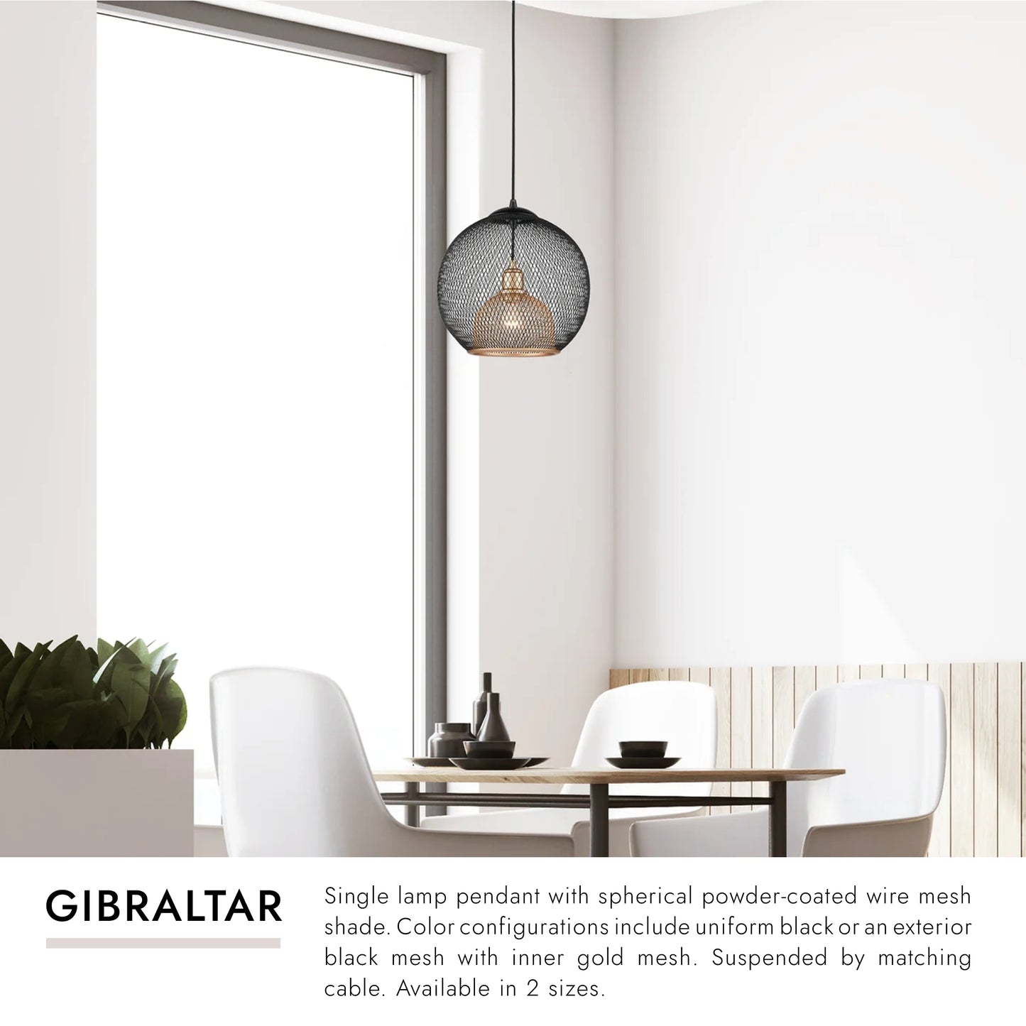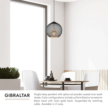 Single lamp pendant with spherical powder-coated wire mesh shade. Color configurations include uniform black or an exterior black mesh with inner gold mesh. Suspended by matching cable. Available in 2 sizes.