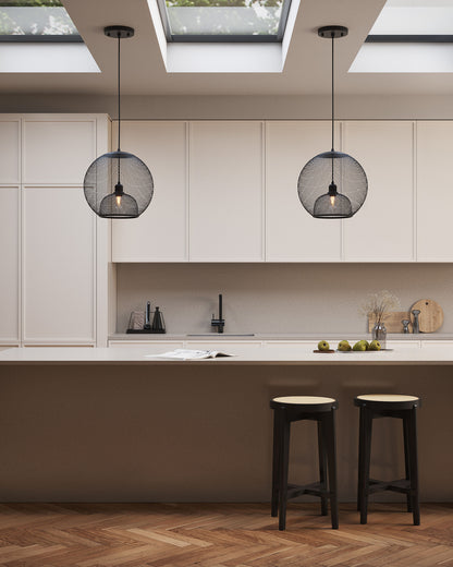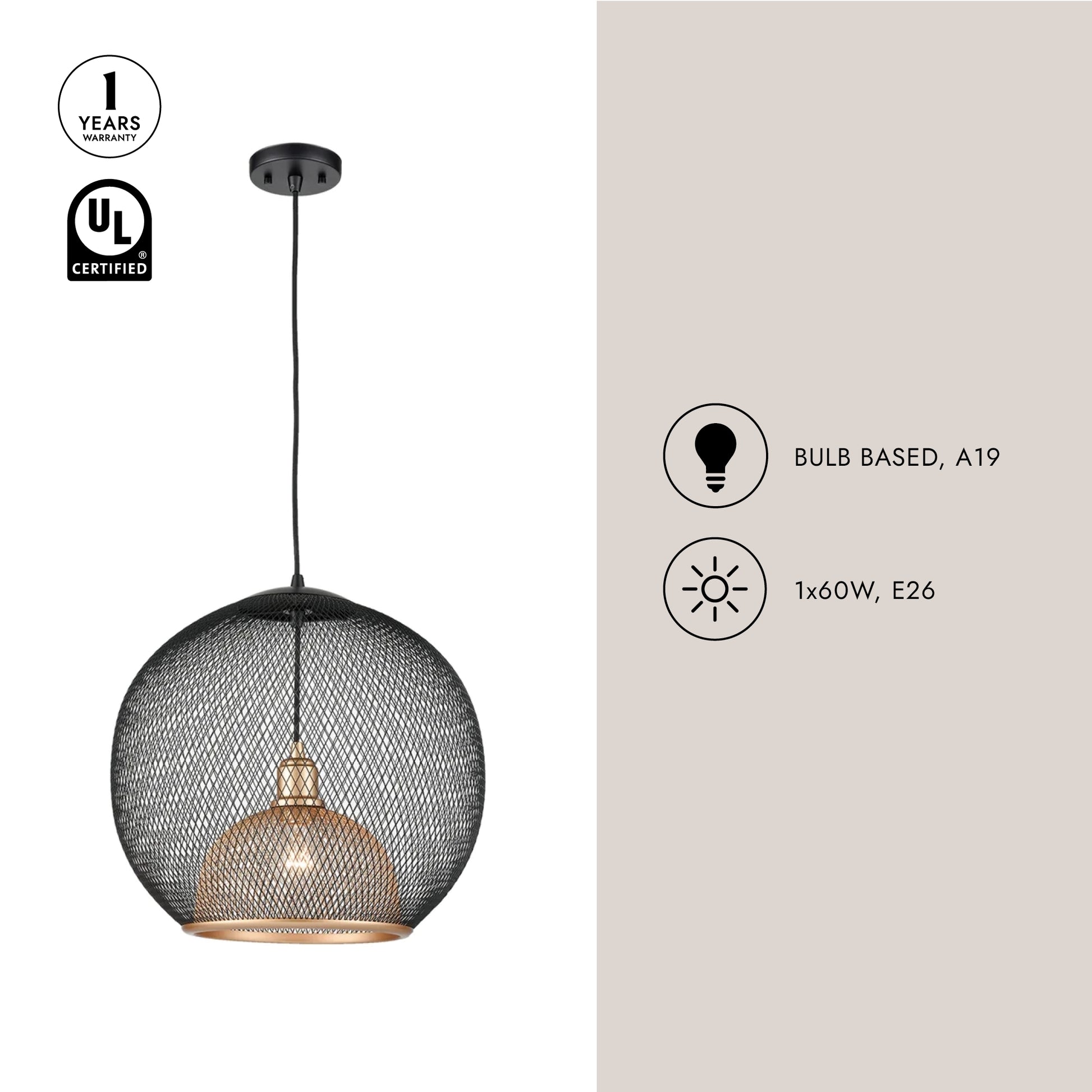 Single lamp pendant with spherical powder-coated wire mesh shade. Color configurations include uniform black or an exterior black with inner gold mesh. Suspended by matching cable. Available in 2 sizes.