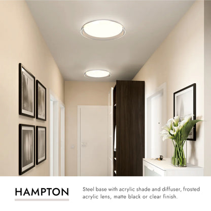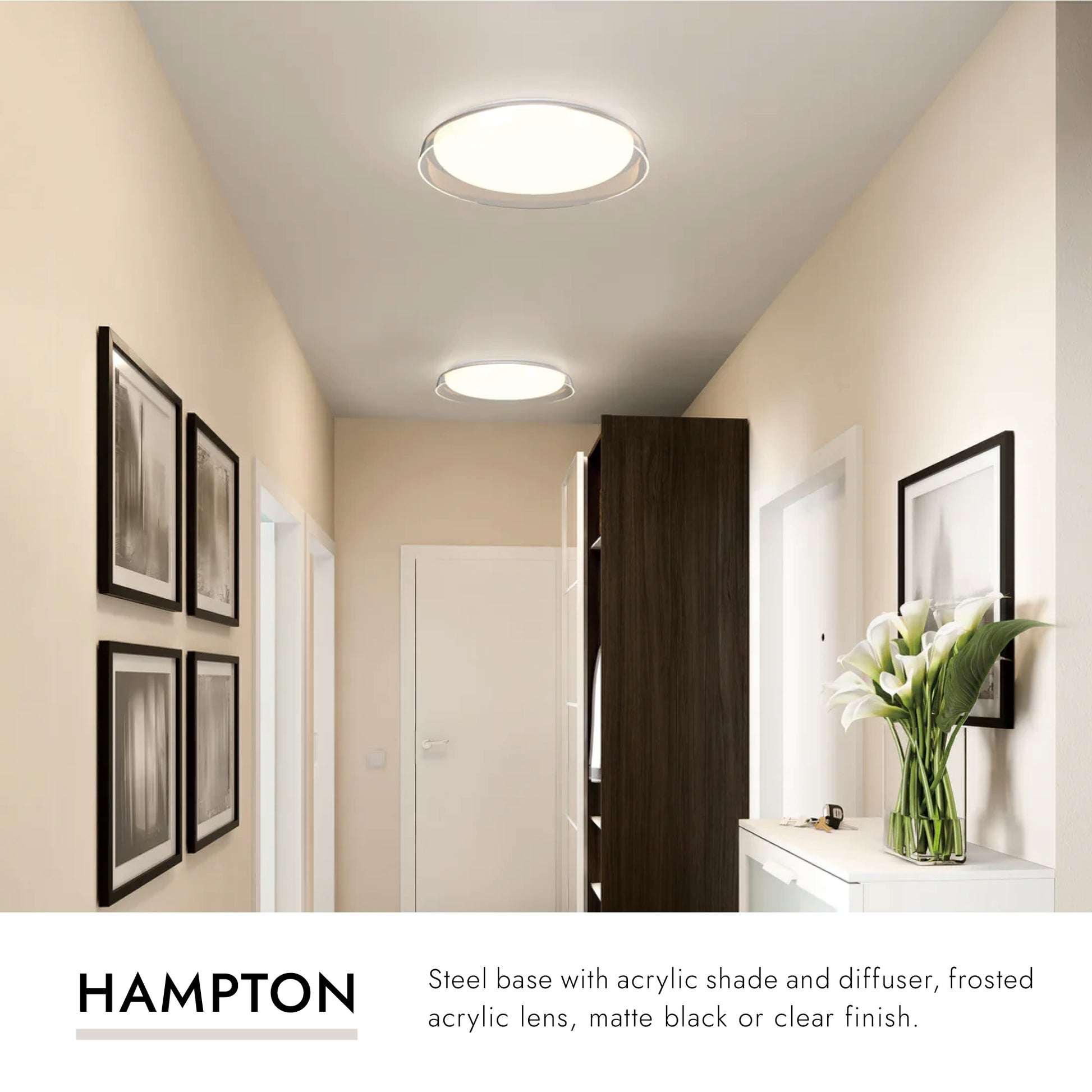 Steel base with acrylic shade and diffuser, frosted acrylic lens, matte black or clear finish.
