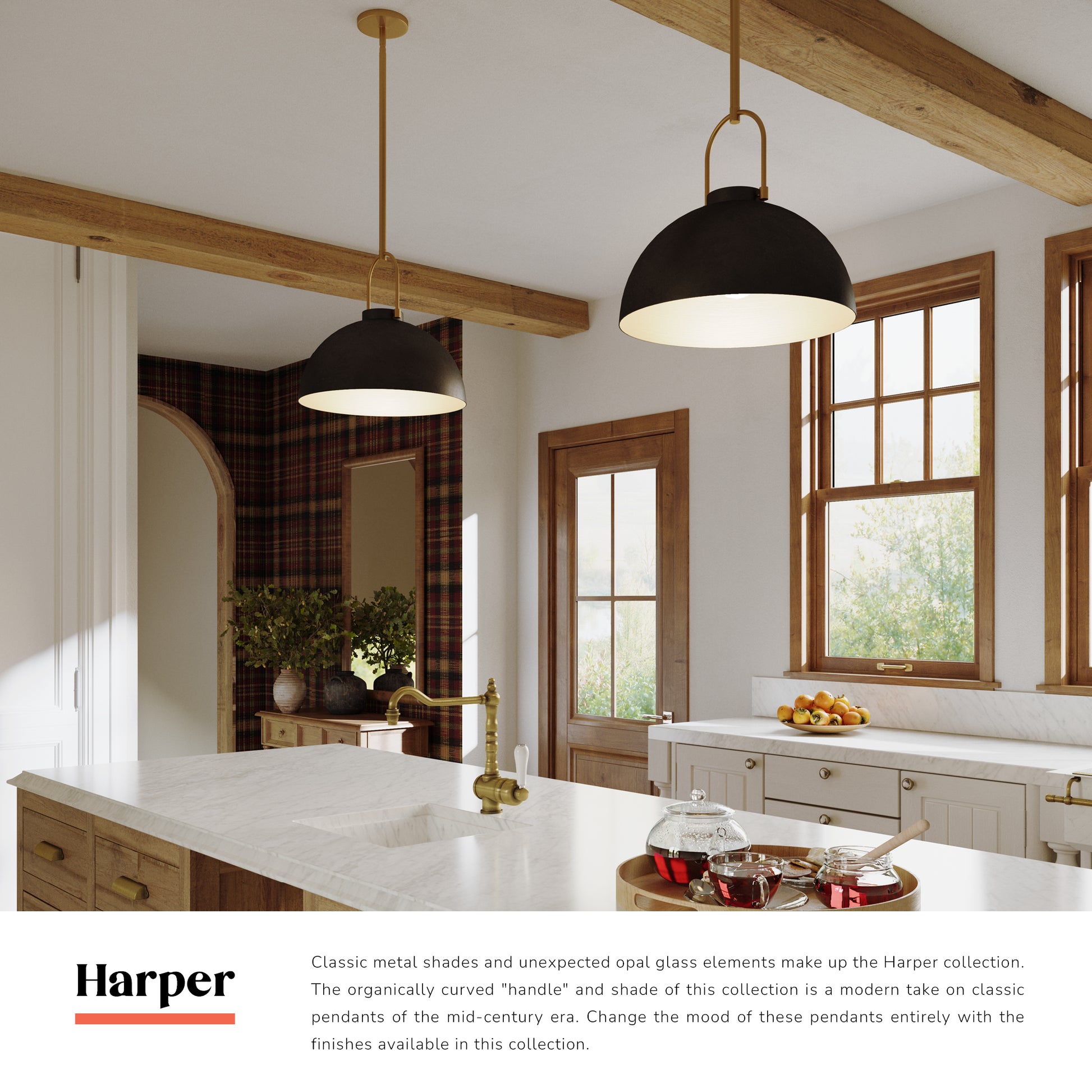 Classic metal shades and unexpected opal glass elements make up the Harper collection. The organically curved "handle" and shade of this collection is a modern take on classic pendants of the mid-century era. Change the mood of these pendants entirely with the finishes available in this collection.