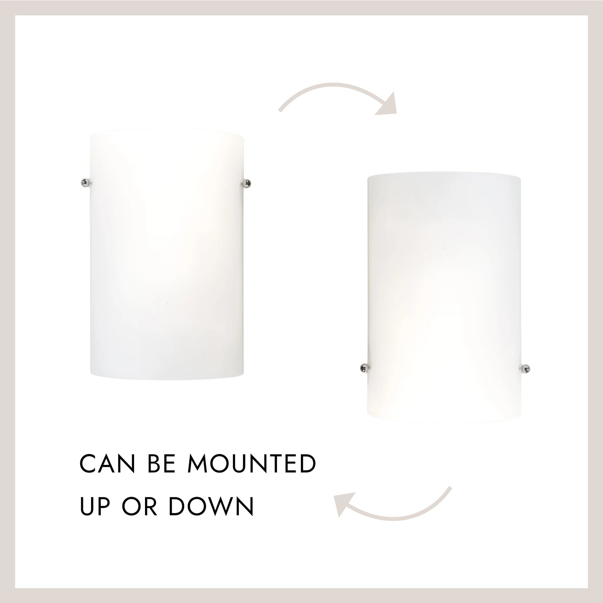 Single lamp wall sconce with half cylinder shaped white opal glass. Metal details in brushed nickel and chrome finish, both decorative nut finish options included within fixture.