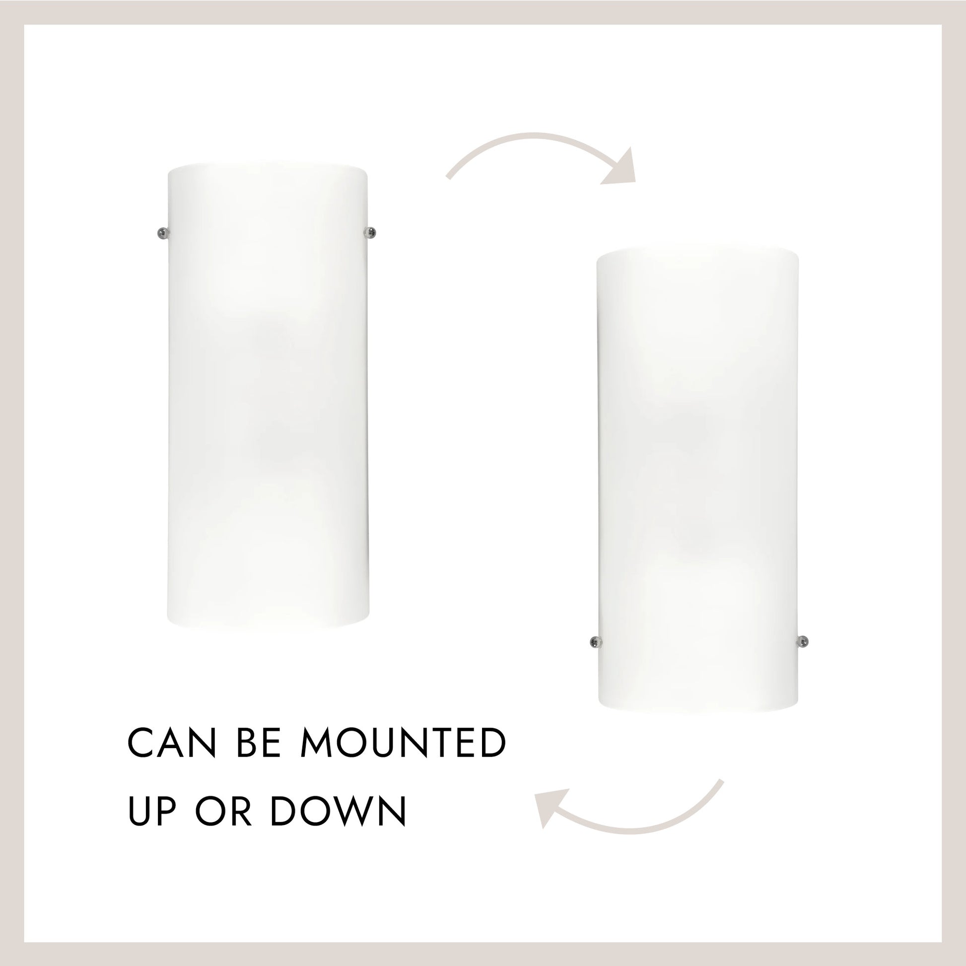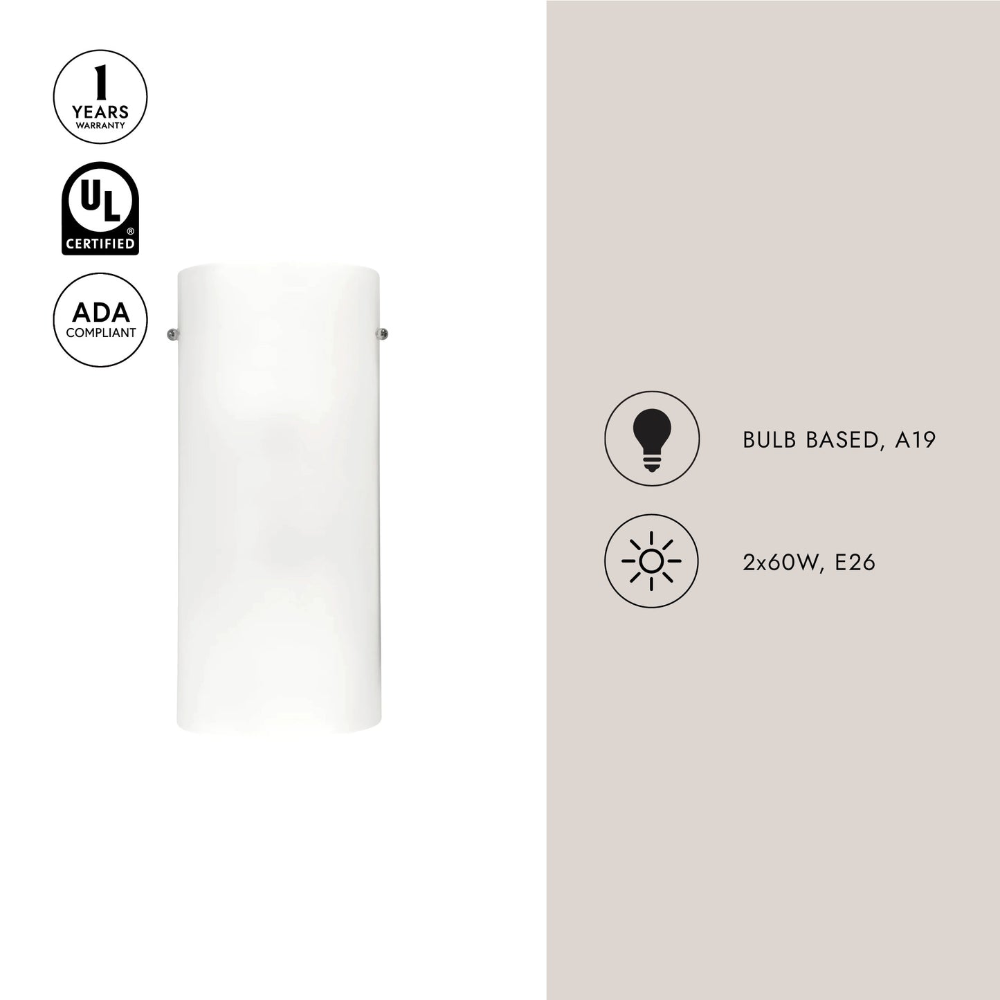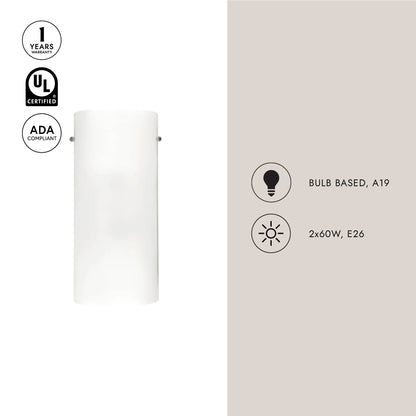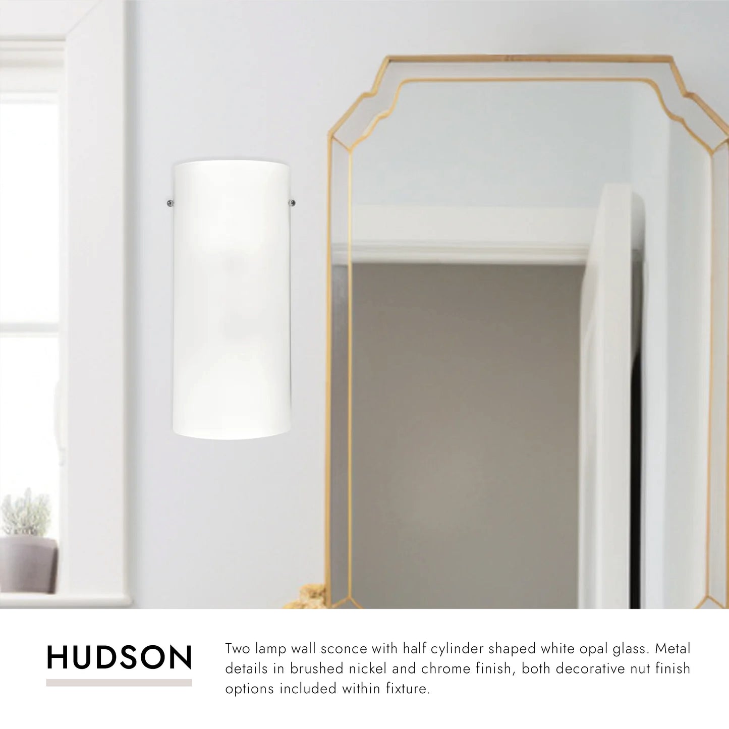 Two lamp wall sconce with half cylinder shaped white opal glass. Metal details in brushed nickel and chrome finish, both decorative nut finish options included within fixture.