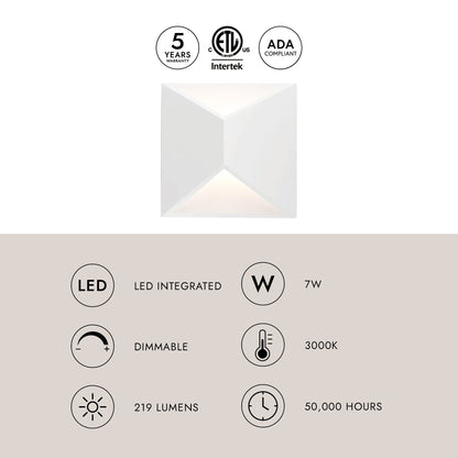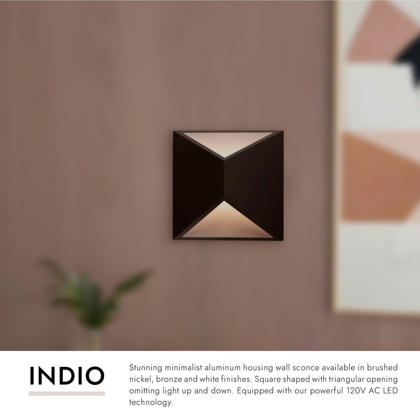 Stunning minimalist aluminum housing wall sconce available in brushed nickel, bronze and white finishes. Square shaped with triangular opening omitting light up and down. Equipped with our powerful 120V AC LED technology