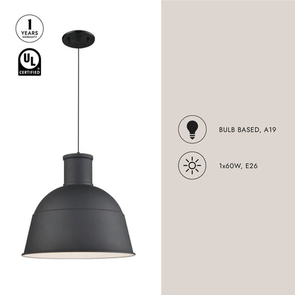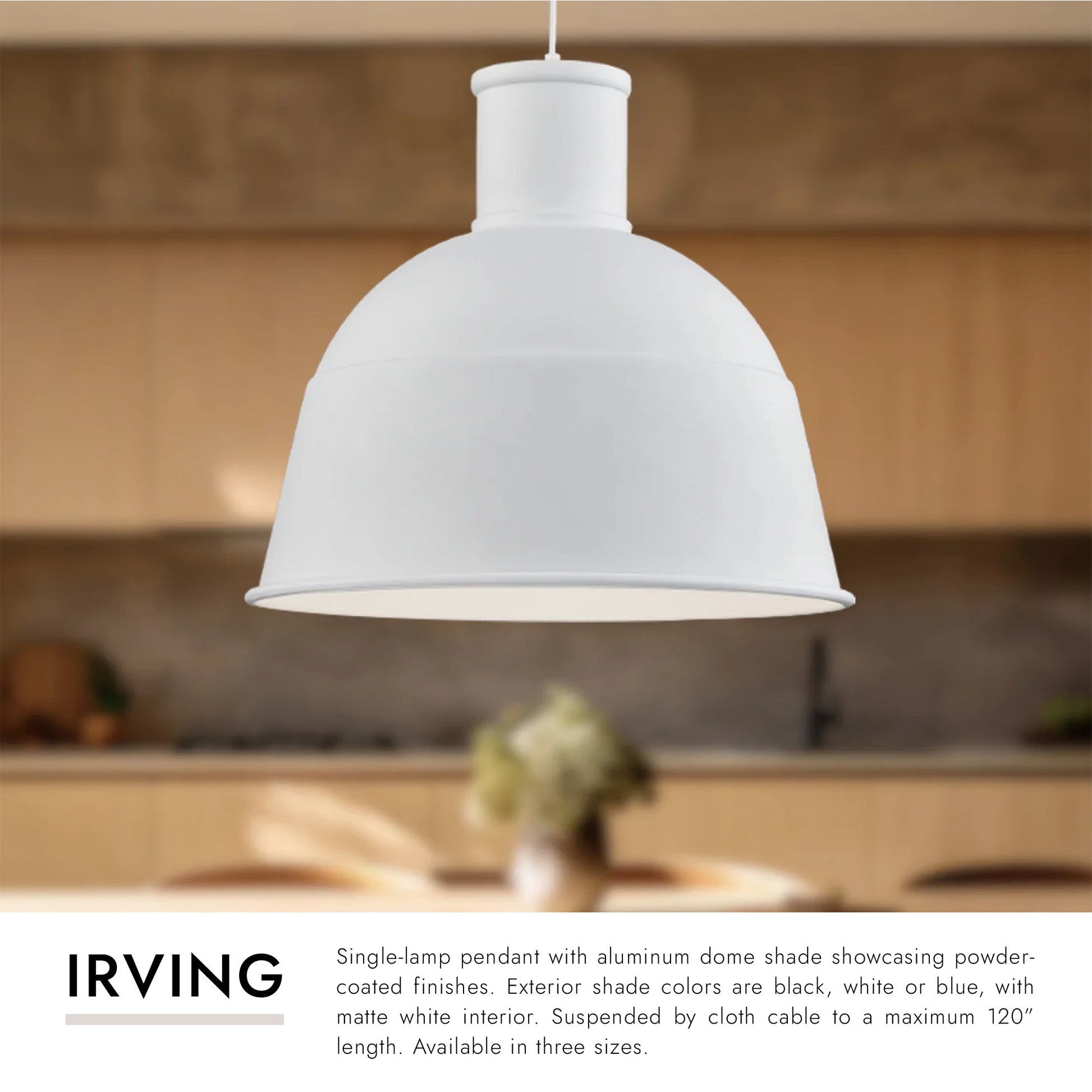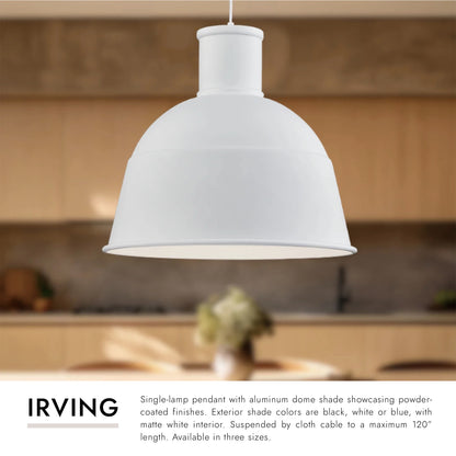 Single-lamp pendant with aluminum dome shade showcasing powder-coated finishes. Exterior shade colors are black, white or blue, with matte white interior. Suspended by cloth cable to a maximum 120" length. Available in three sizes.