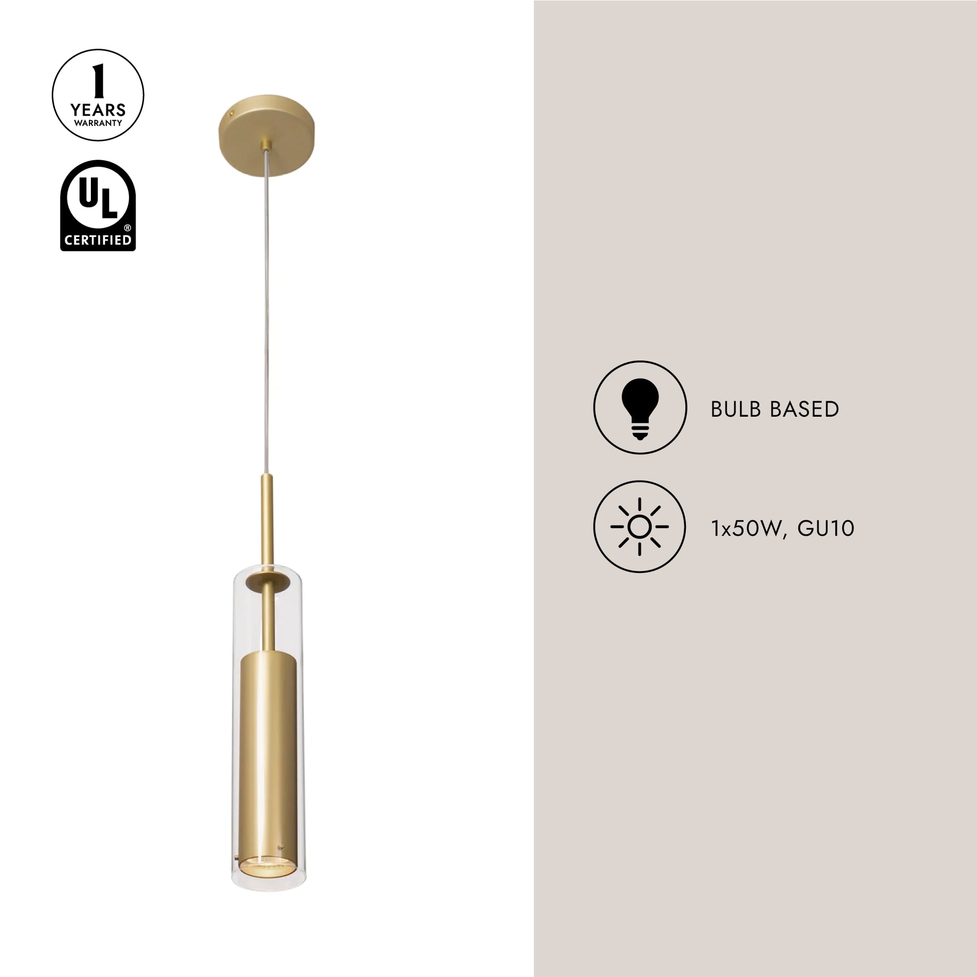 Clear glass shade encases aluminum cylindrical socket housing with matte powder-coat or plated finish. Down light